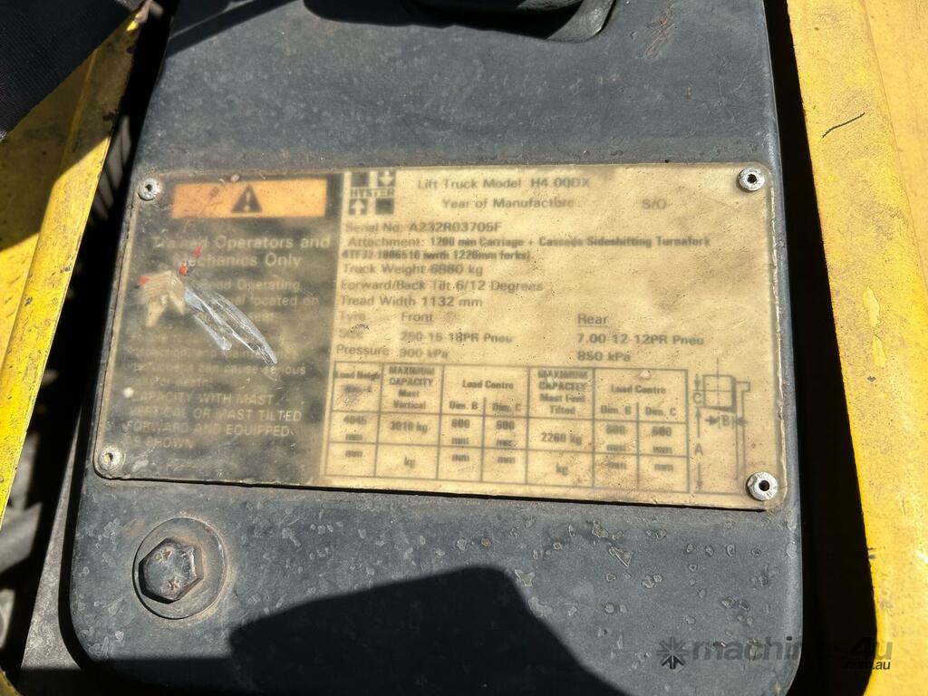 No C/P,Hyster,H4.00DX,Forklift,LPG only,Odometer not visible,6284 (Hrs. Showing on Hour meter),Colour: Yellow,Unregistered,Serial No: A232R03705F,Sold with No Plates,Key No: 381