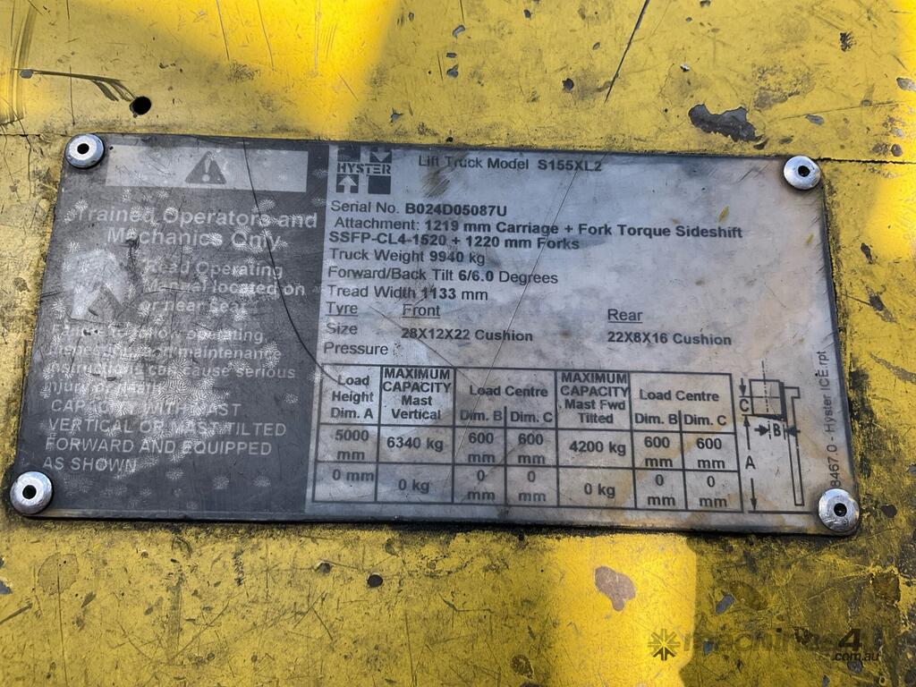 No C/P,Hyster,S155XL2,Forklift,4 Cyl,Gas,Odometer not visible,277 (Hrs. Showing on Hour meter),Colour: Yellow,Rego. No: NP(285491), Unregistered VIC,Serial No: B024D05087U,Sold with No Plates