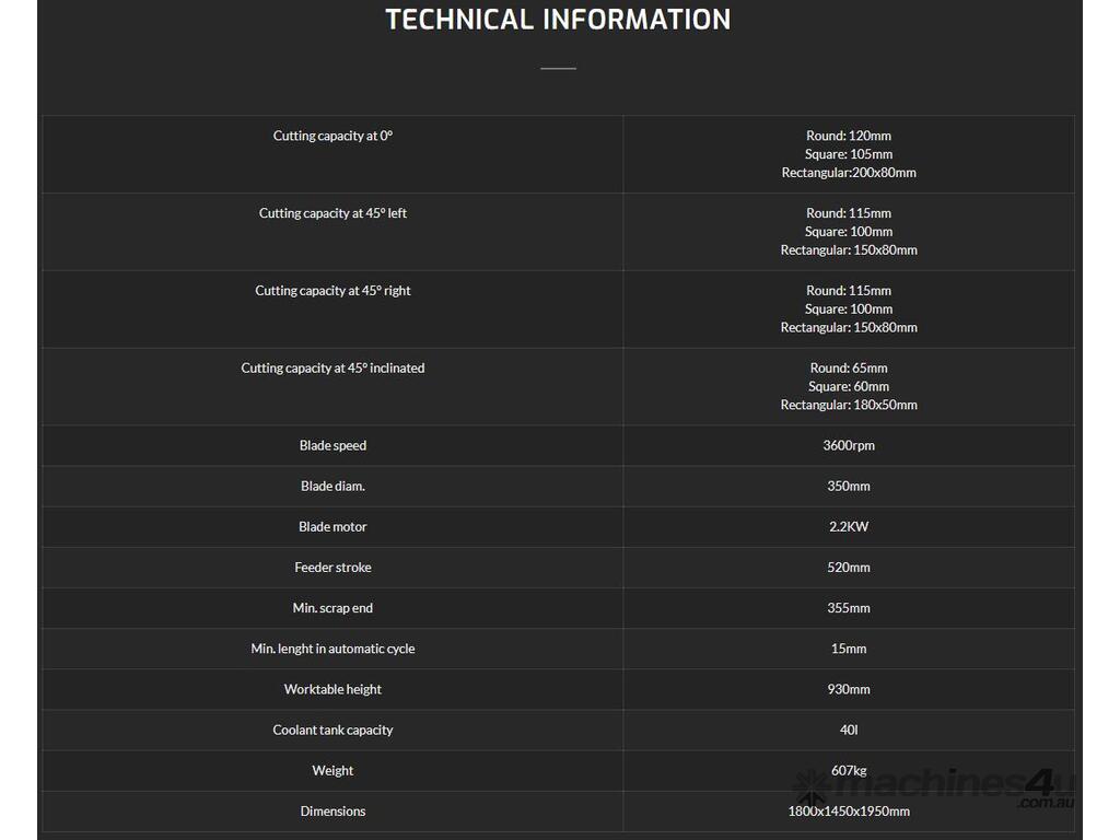Cutting capacity at 90 ° round till 120 mm., square till 105 mm. 200×80 mm.