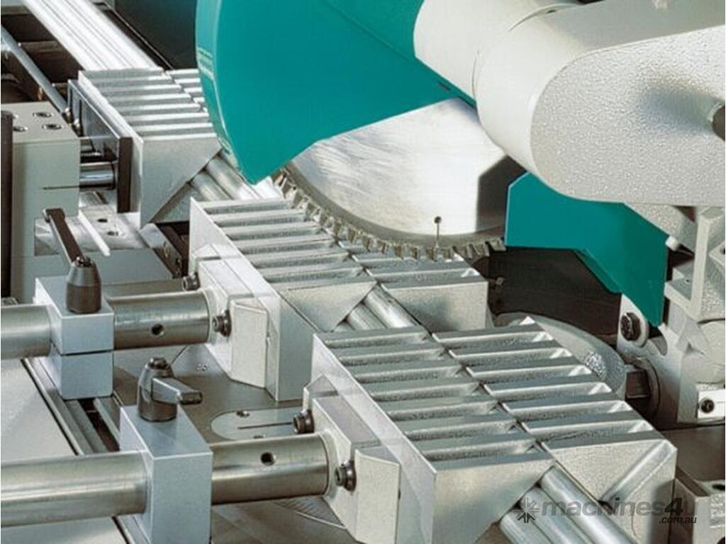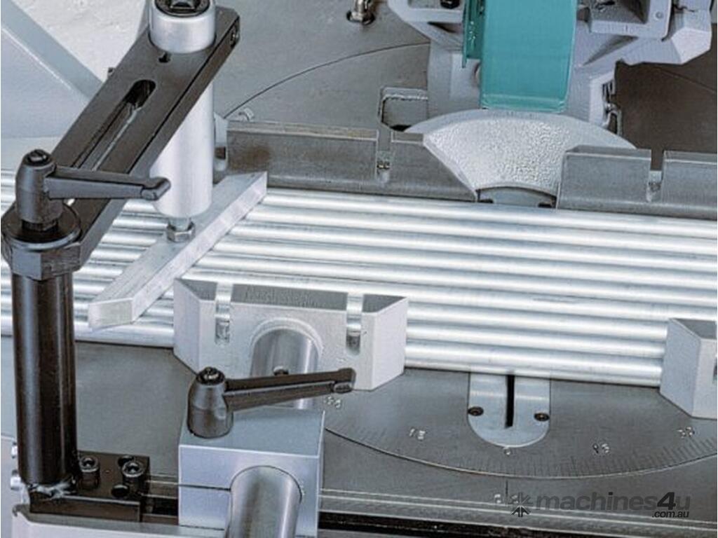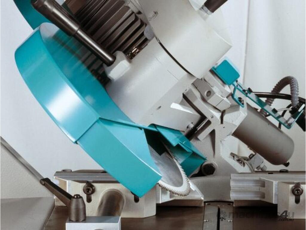 Automatic CNC circular saw suited to cut aluminum light metal solids and profiles with high accuracy. Possibility to set the machine for brass and copper profiles. Mitre cutting from 0° to 45° left and right. (05.) The head bends 45° on the vertical axis to allow inclined cuts.