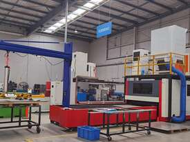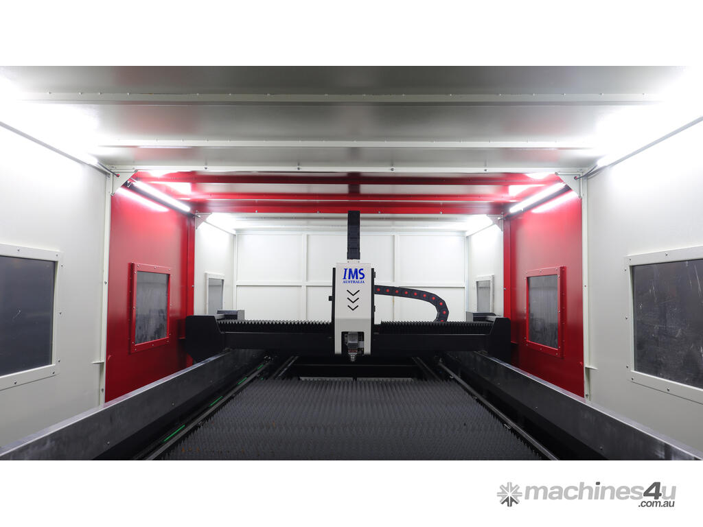 The machine features a fully enclosed cutting area that meets Australian safety standards, along with an automatic exchange table for continuous production and increased productivity.