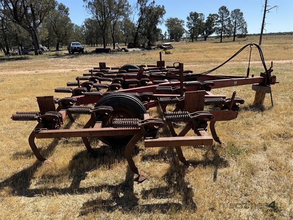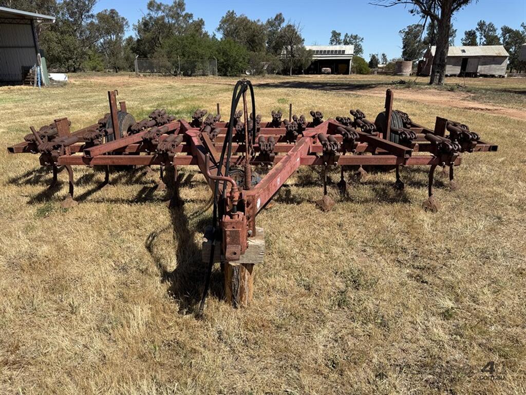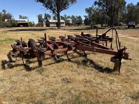 Circa 1970 International 211 33 Tyne Scarifier with knock on points, hydraulic ram and hoses fitted. Manually operated wing fold system on both sides. Converts machine back to 25 tyne for breaking fresh ground up and back to 33 tynes for worked ground. Very well designed any simple setup just remove bolts and lift wings up with supplied bar. Wings sit in cradle attached to bar. 10 new points supplied with machine. 5.67m wide, 4.3m wide to wing fold brackets,4.67m long. Scarifier is in good condition. Locate