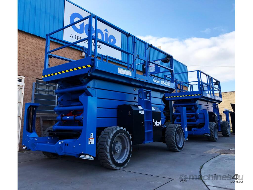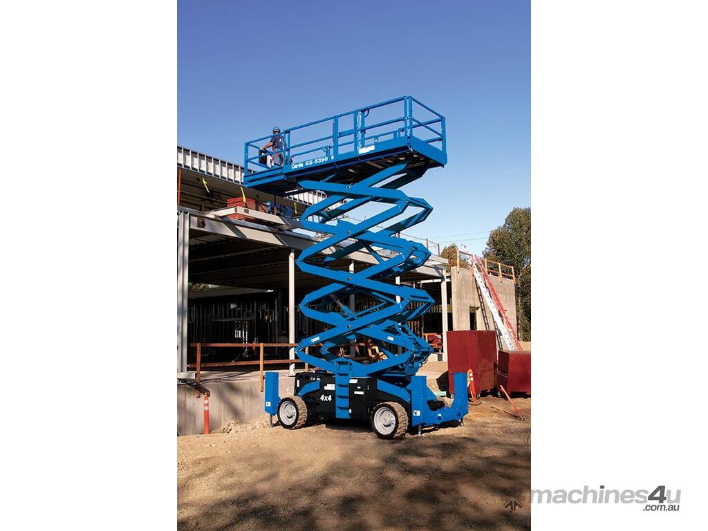 The Genie® GS™-5390 rough terrain scissor lift is built for extra-rugged performance and is able to traverse through uneven rough terrain environments.