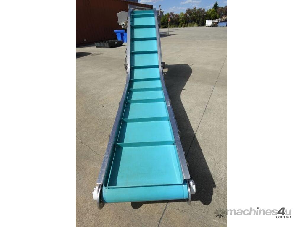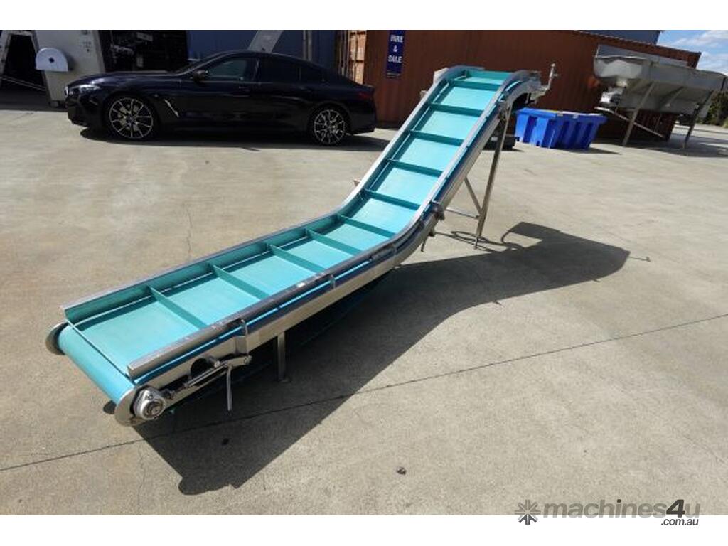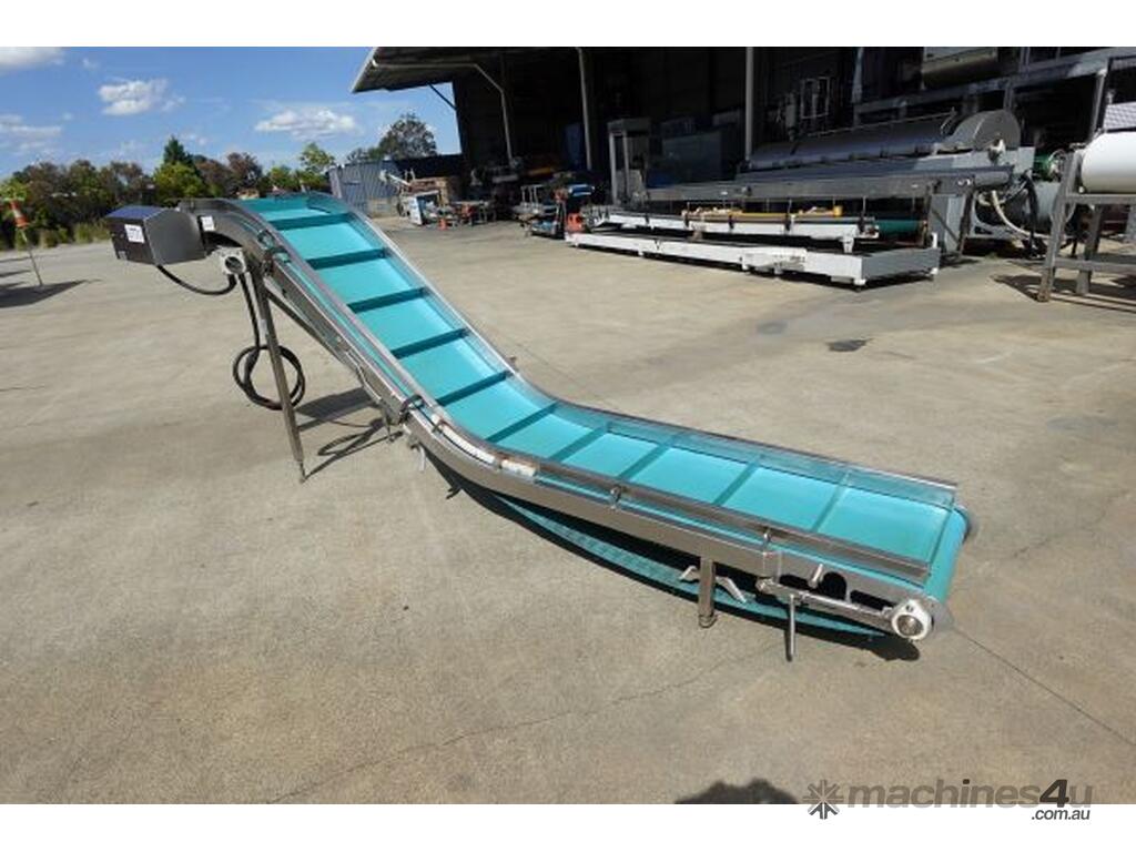 Unit is a stainless steel food grade incline belt conveyor.