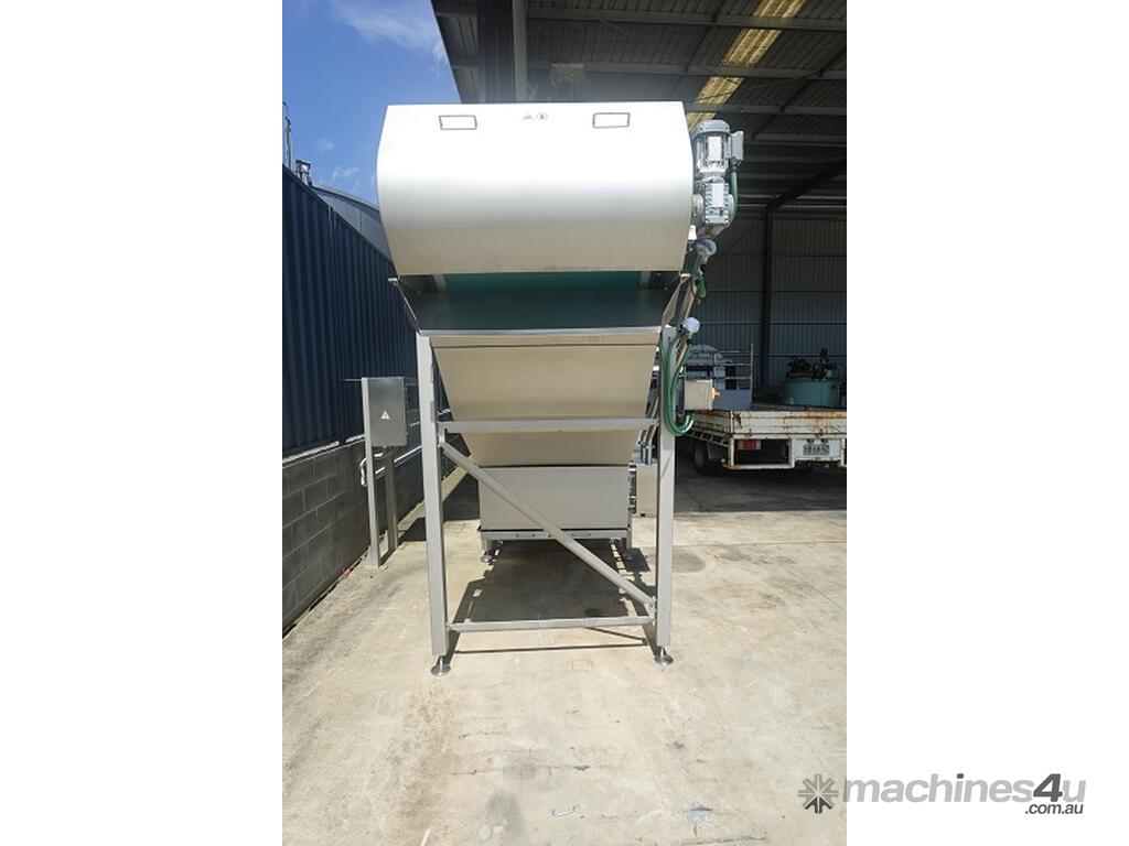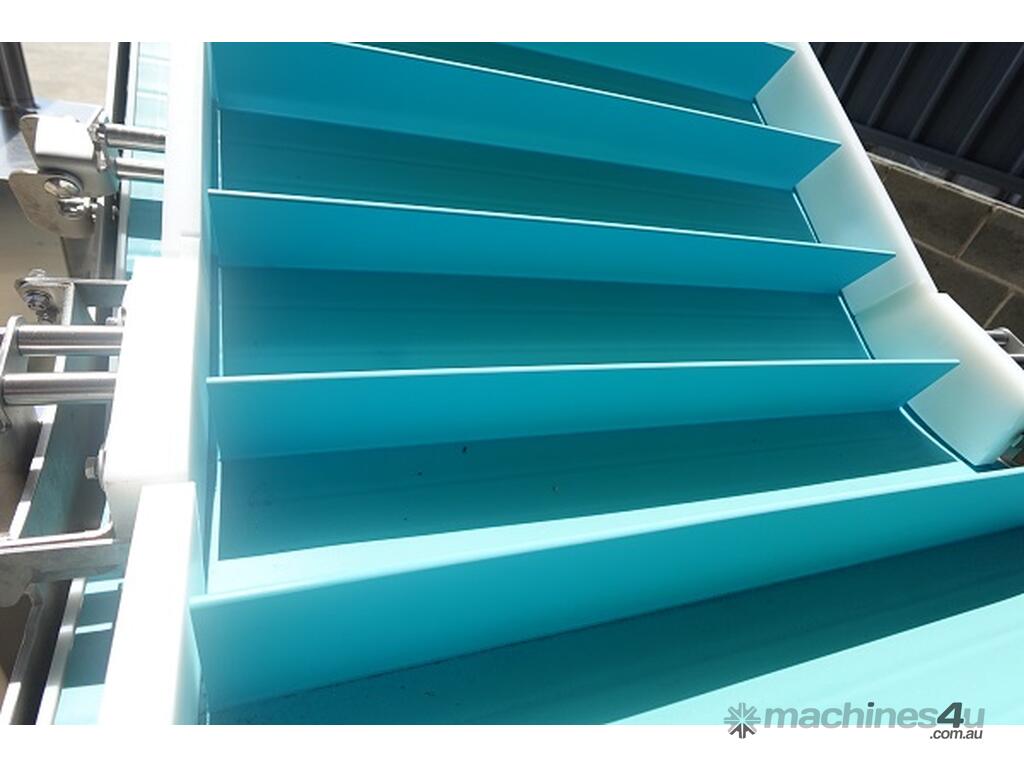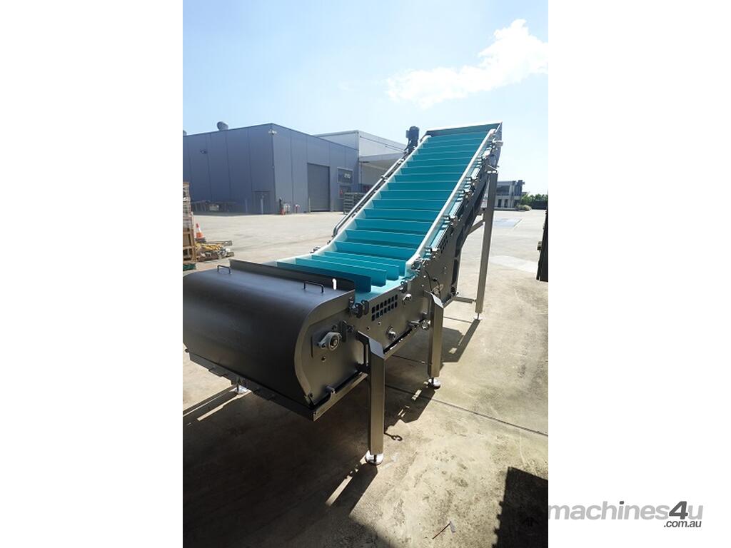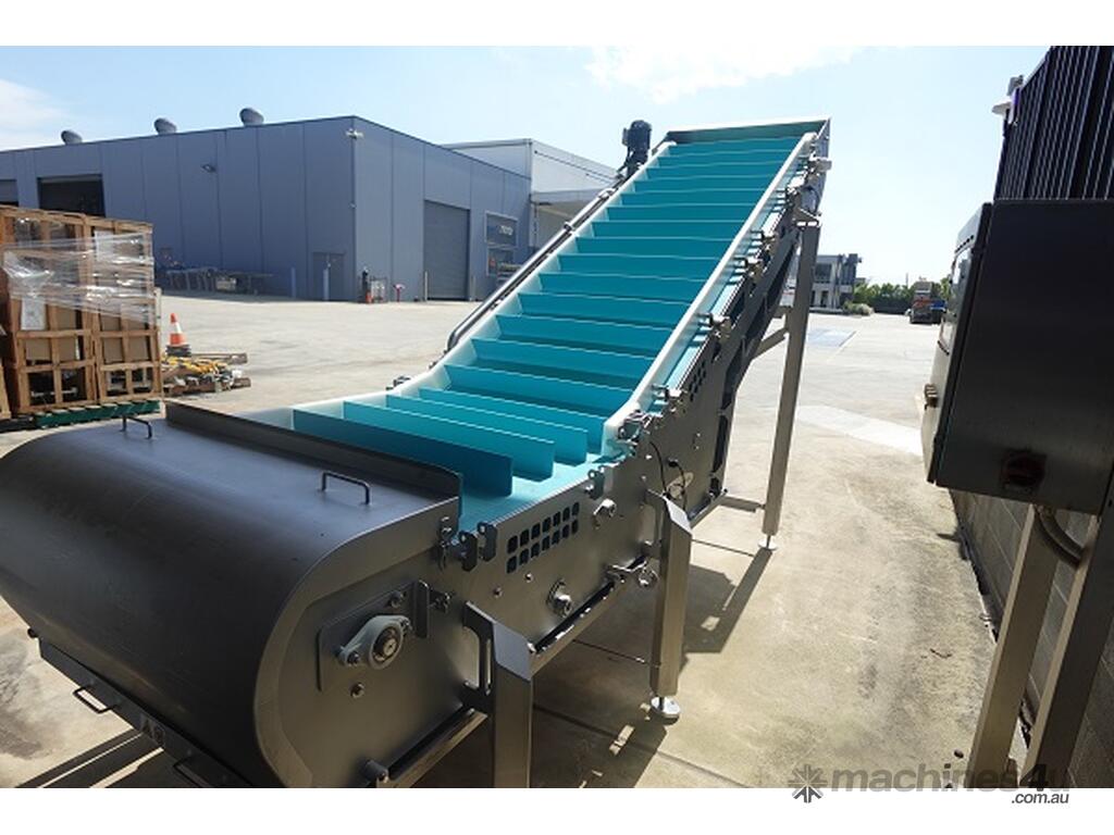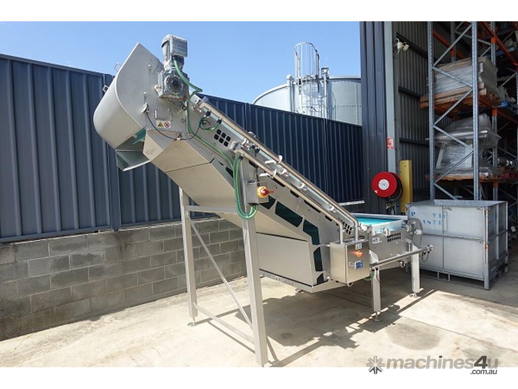 Unit is a stainless steel food grade motorised incline belt conveyor.