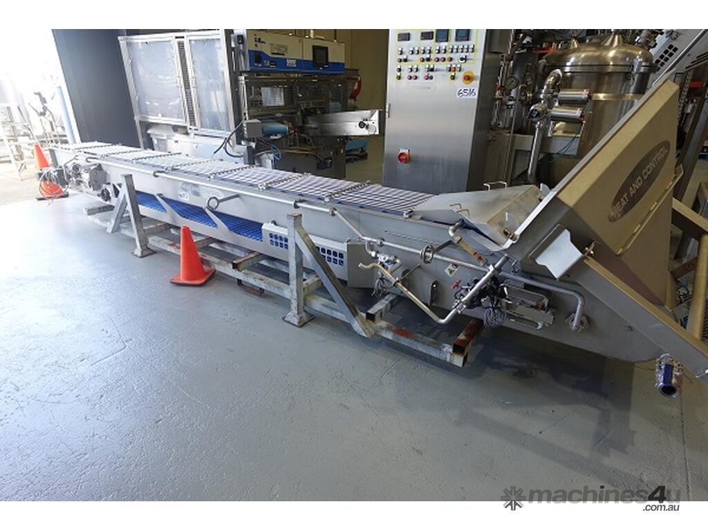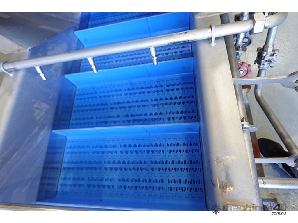 Conveyor is fitted with spray wash nozzles, infeed stainless steel hopper & stainless steel safety gaurding.
