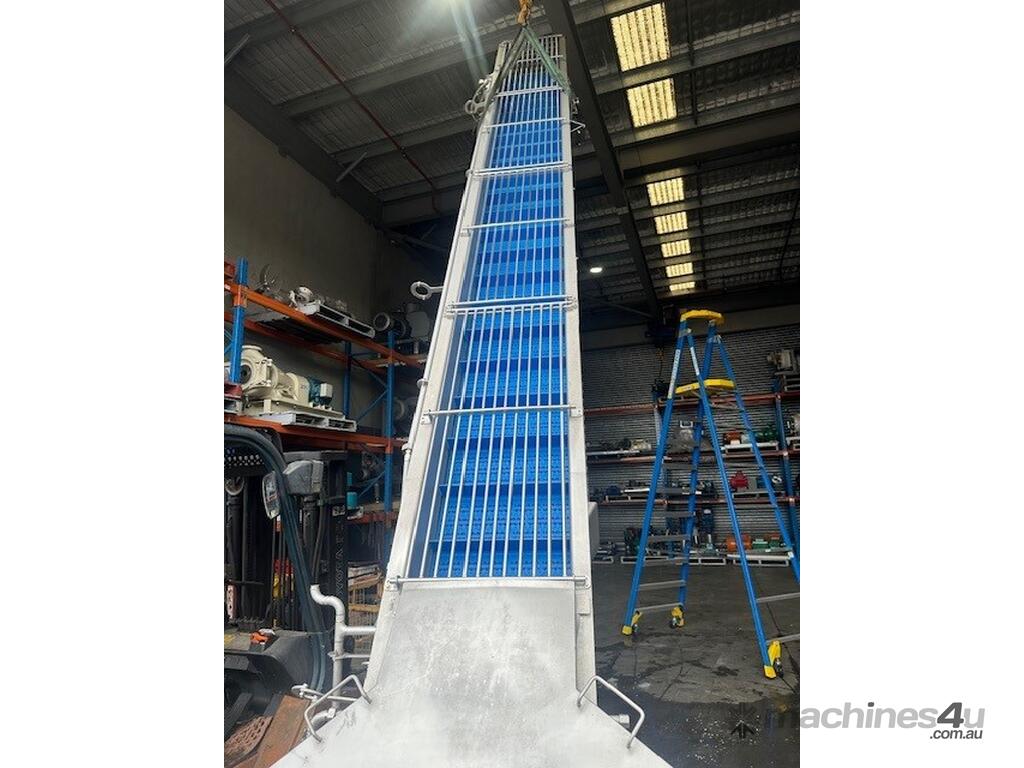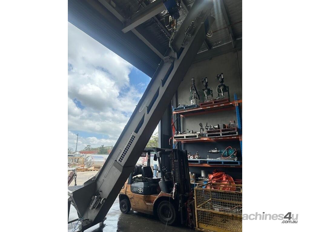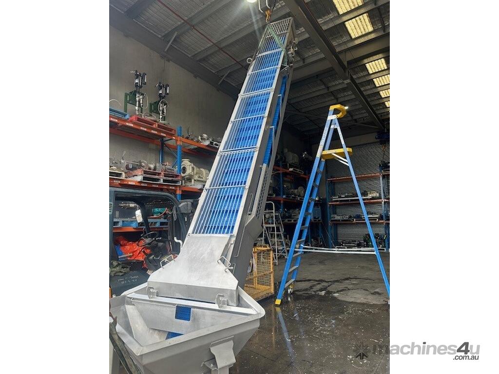 Unit is a stainless steel motorised food grade incline conveyor fitted with Intralox belting.