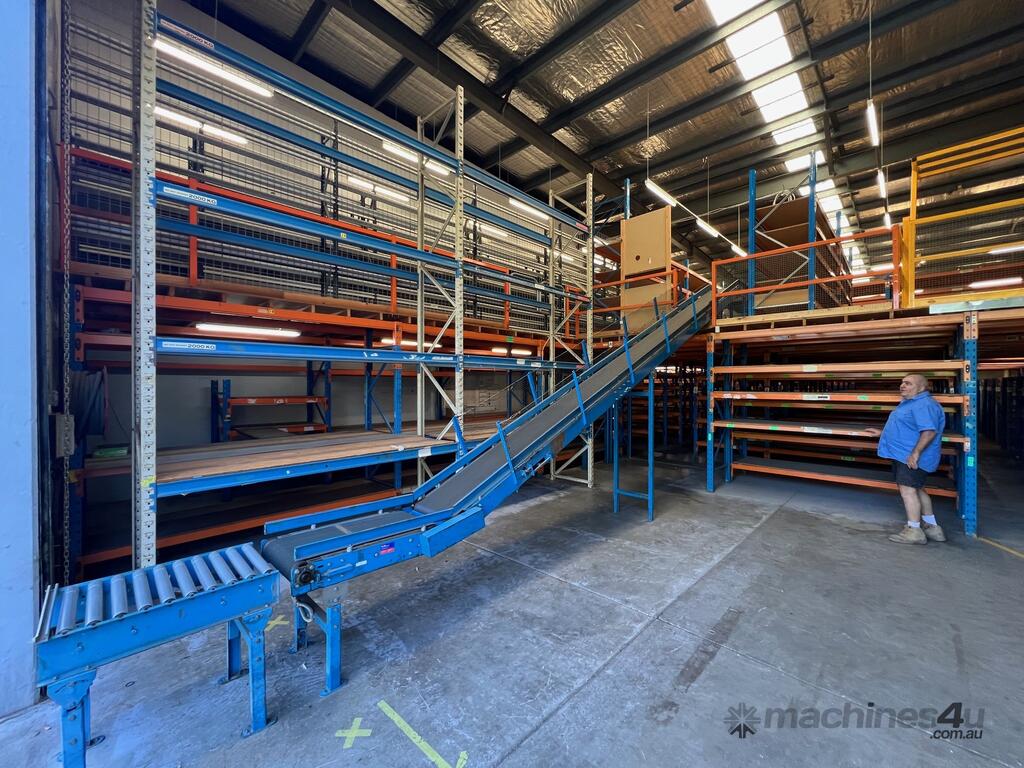 This incline conveyor system is built to seamlessly transport materials from ground level to elevated platforms or mezzanines. Designed for durability and efficiency, it’s perfect for a variety of industrial applications.