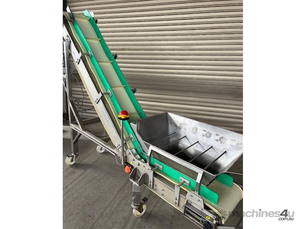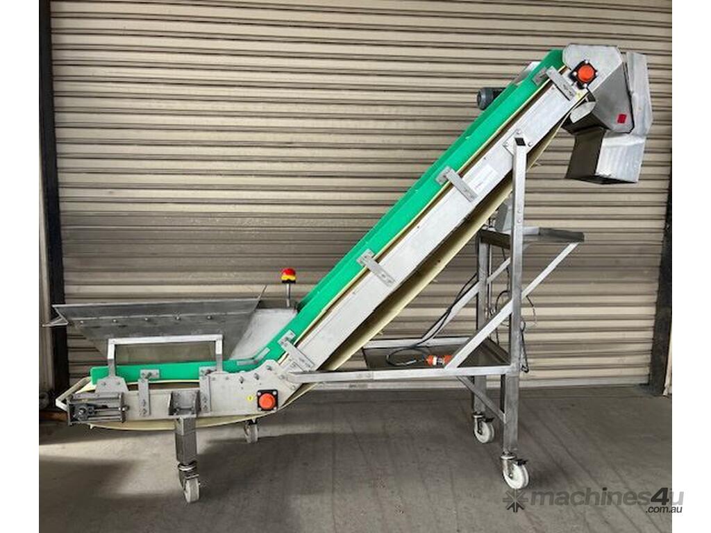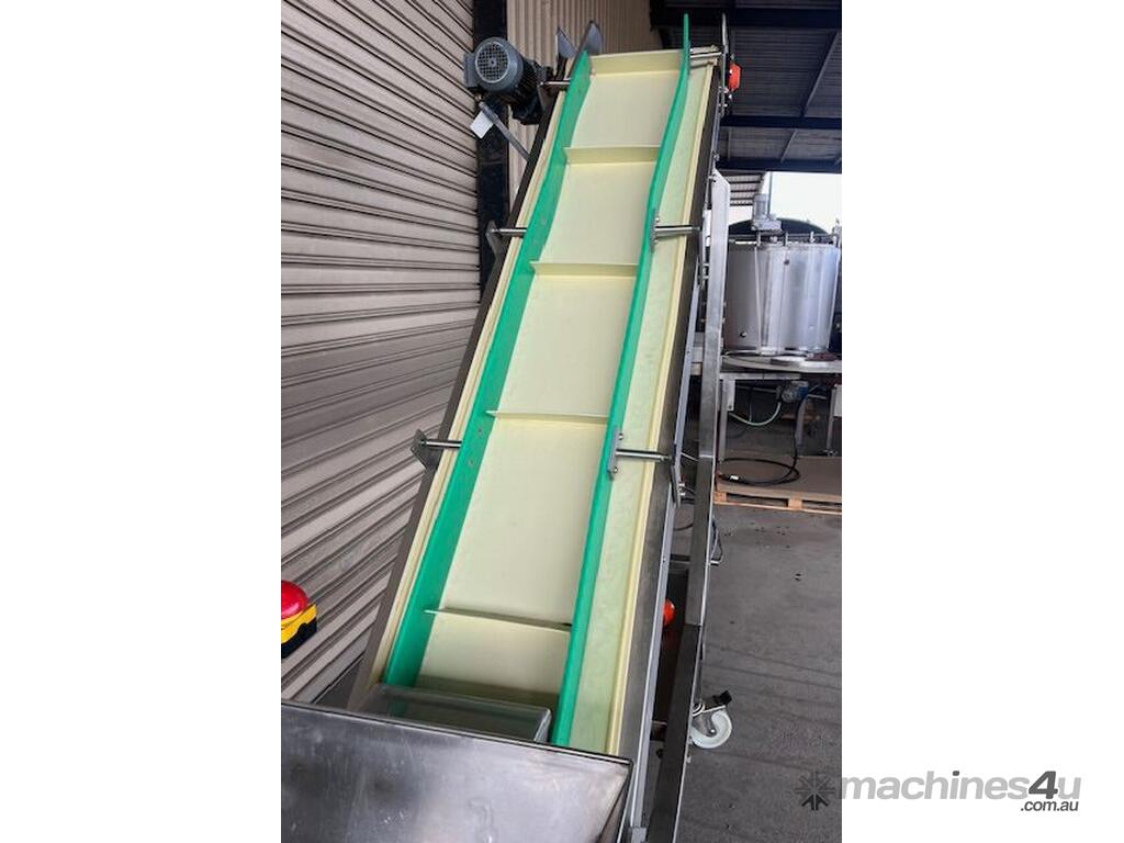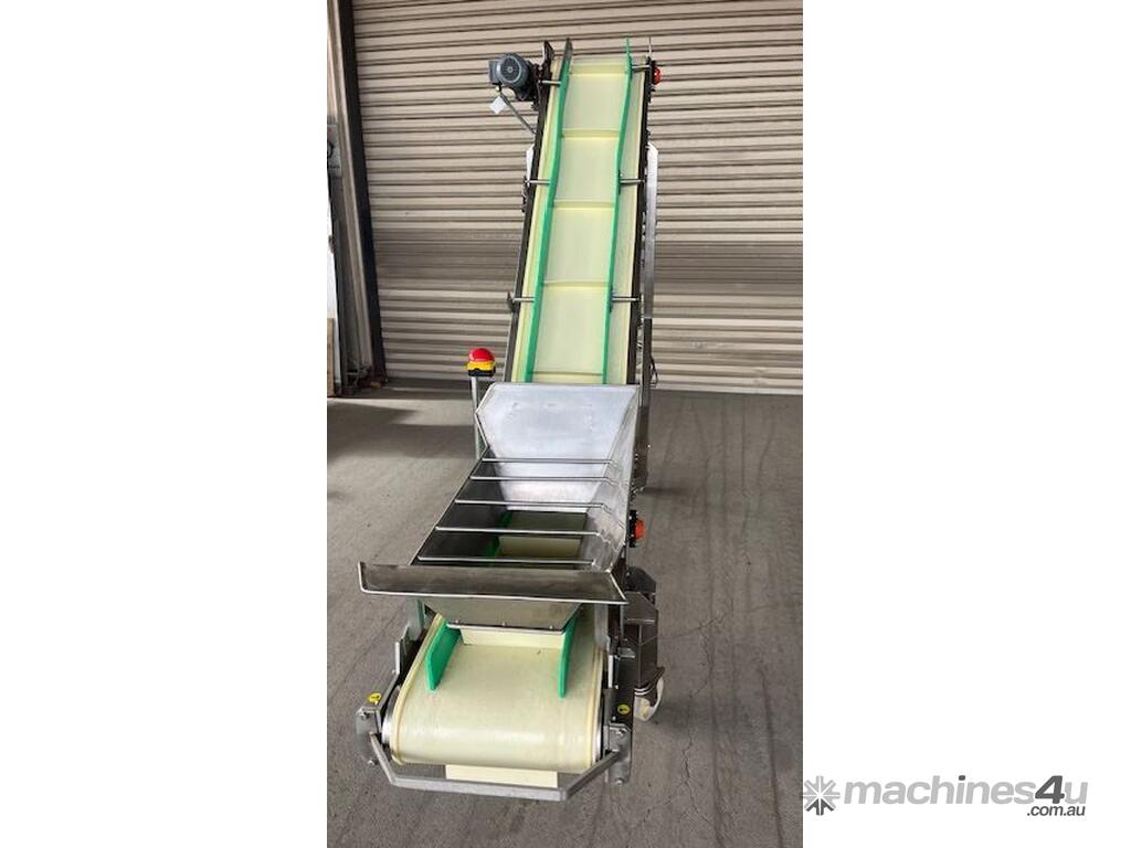 Cleated incline conveyor. All stainless steel frame with a food grade cleated belt. Cleats are 75mm high 280mm wide belt x 2.1m incline section and 800mm flat section. Height from ground to loading hopper is 900mm Height from ground to belt discharge is 2.2m Height from ground to the bottom of the outlet hopper is 1.7m. Mounted on castor wheels. SEW 0.55kw 31 rpm geared motor. Ex Confectionery plant.