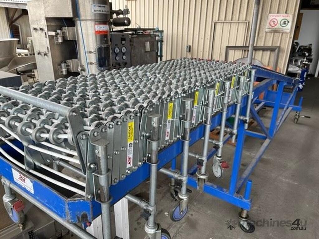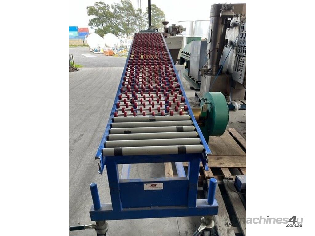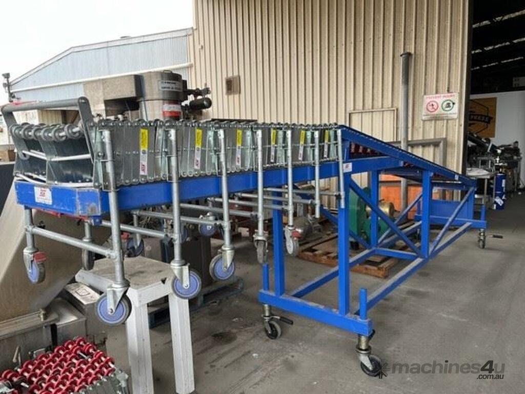 Incline roller type conveyor with extendible coveyor section at one end. 4 mt long x 600mm wide incline section. Discharge height is approx 1.5mt. 1.6mt long x 600mm wide extendible section, will go out to 4 mt. Conveyor is on heavy duty castor wheels. Made by Industrial Conveying Australia.