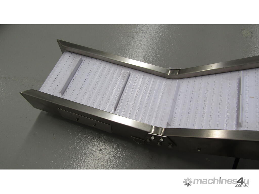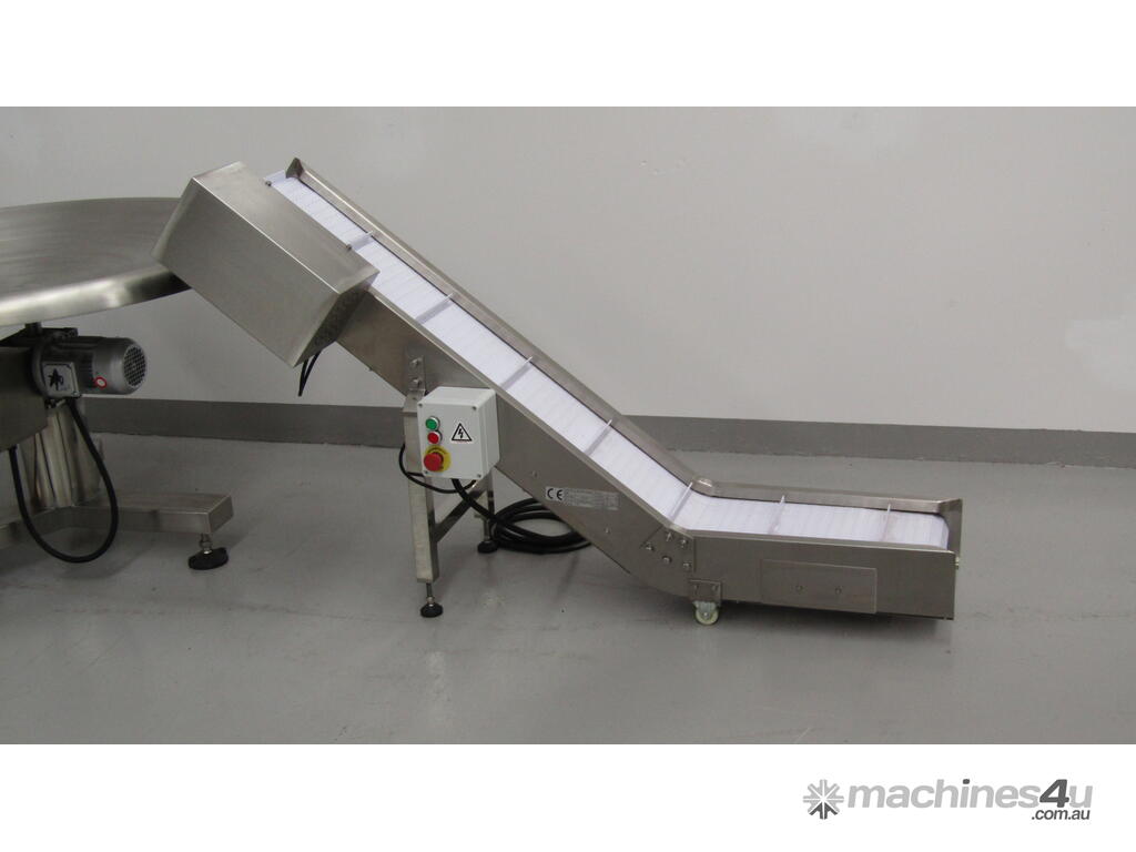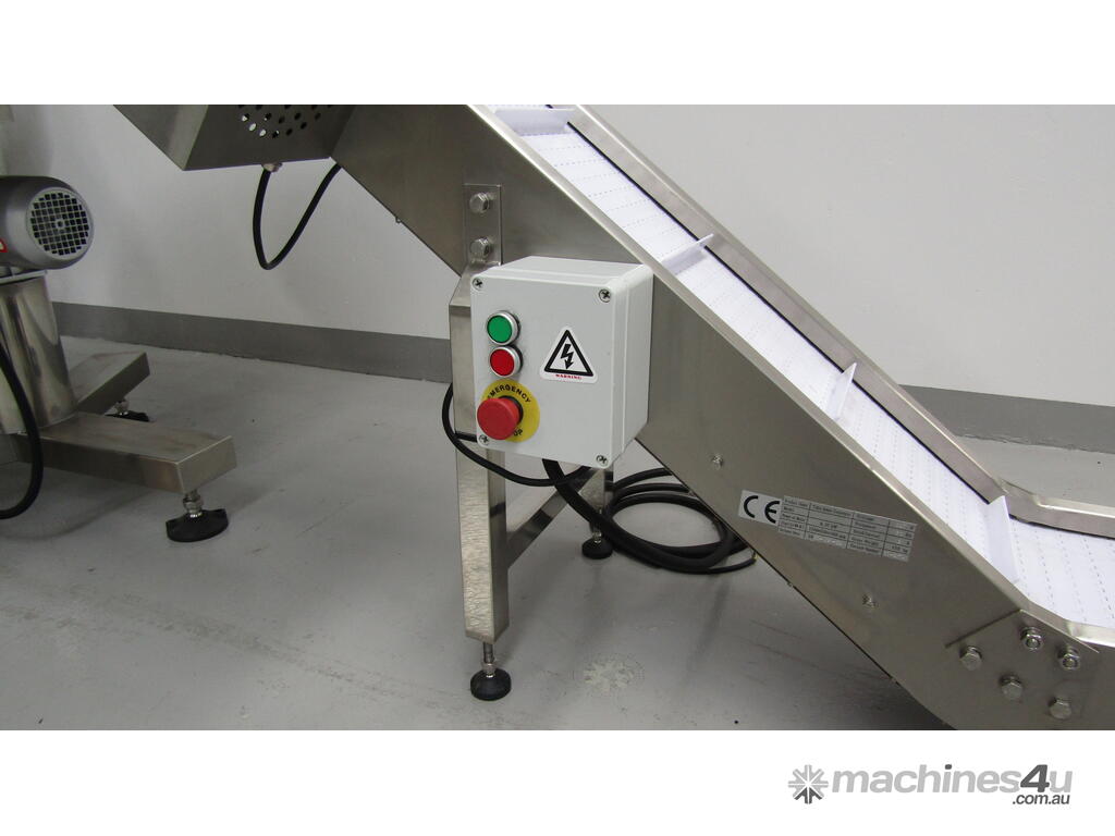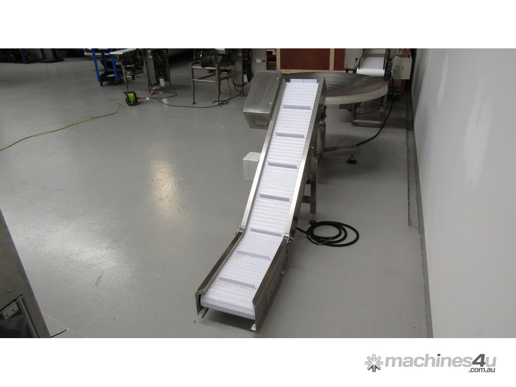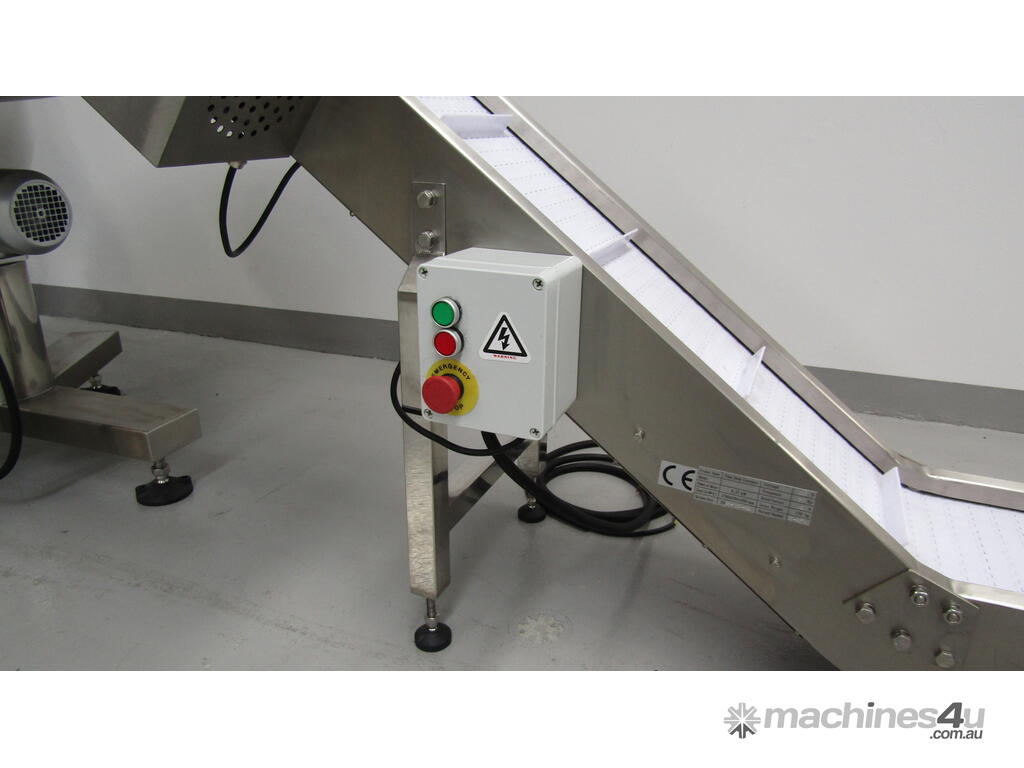 This stainless steel conveyor is designed to elevate product from a low level to a higher level.
