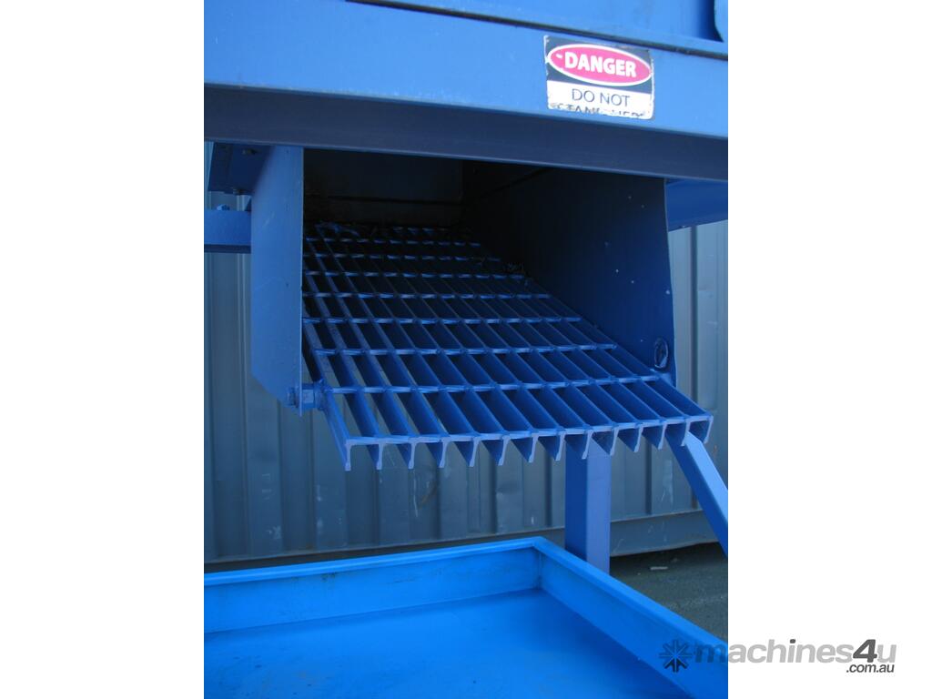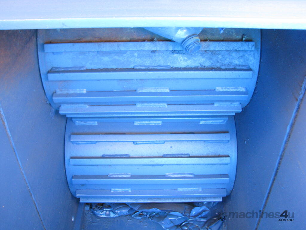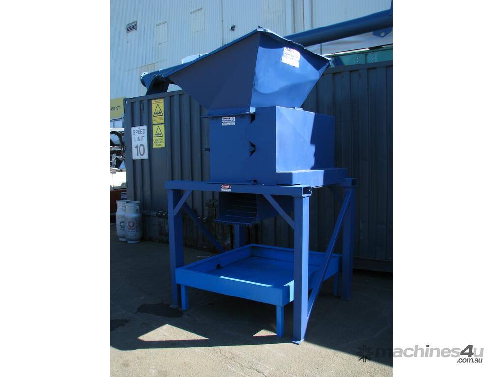 It flattens bottles, cans, containers and other similar items between two rollers, any remaining liquids fall through the grate and into the drip tray sump. The solids fall off to the side where you would have a bin or a conveyor, etc.