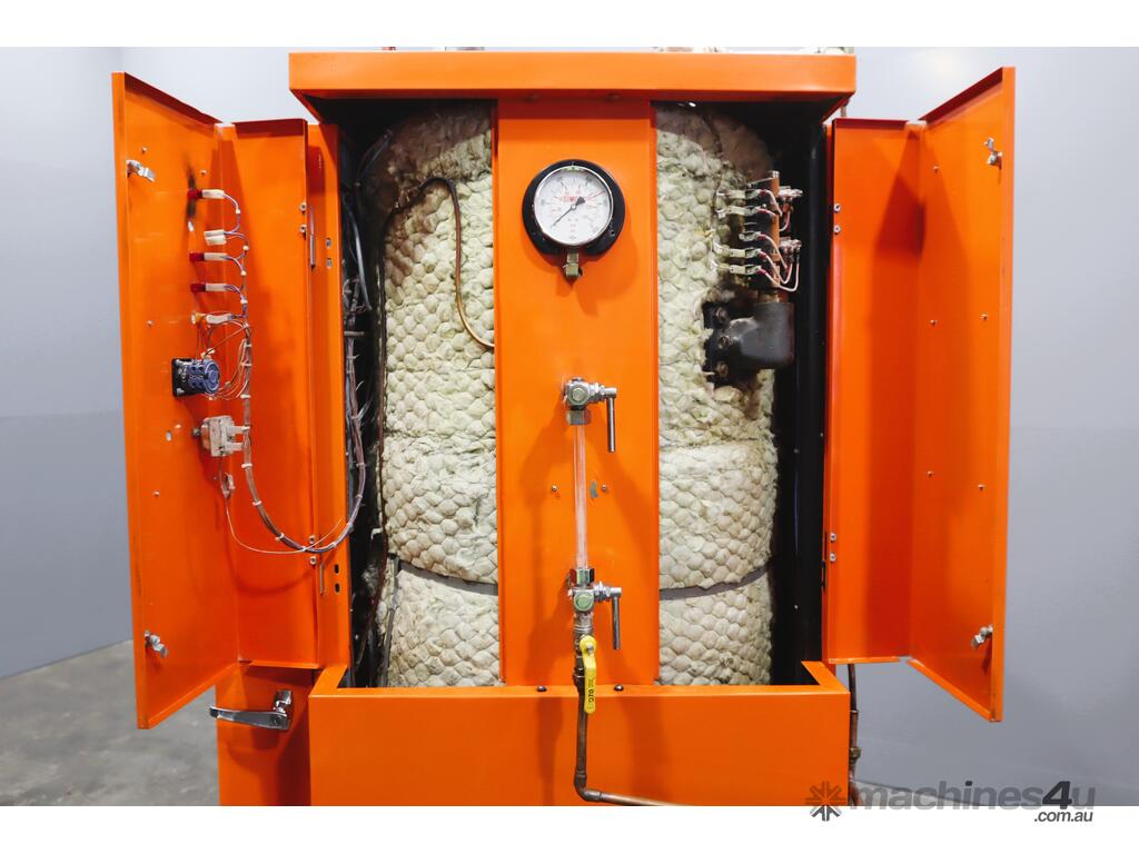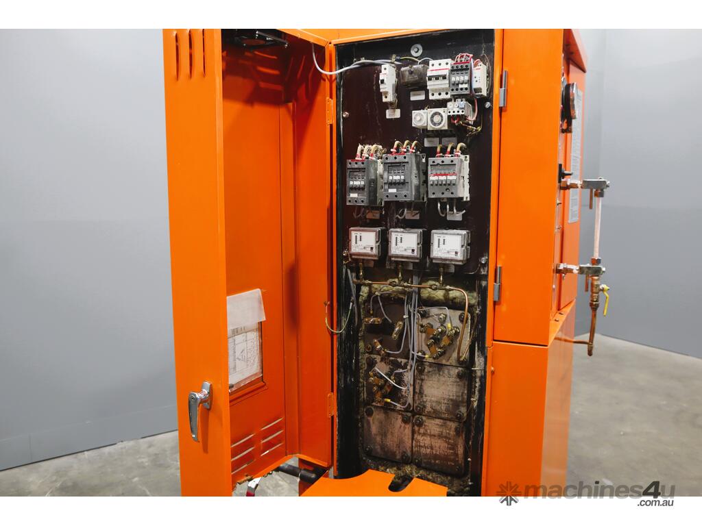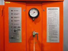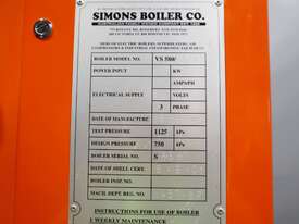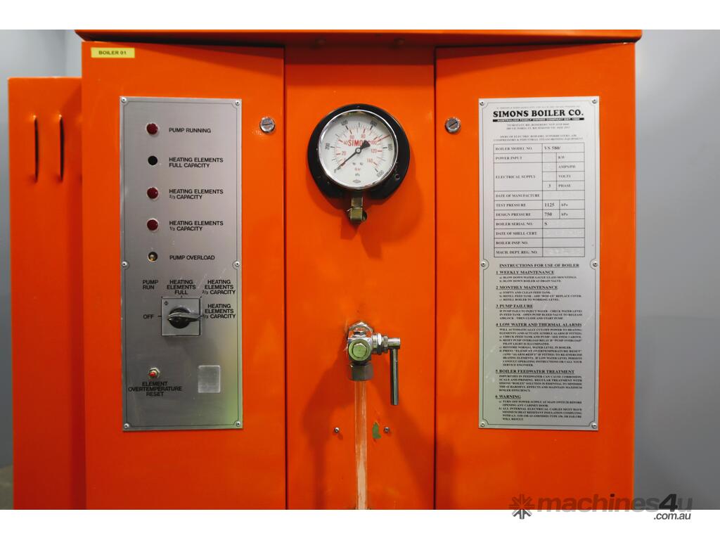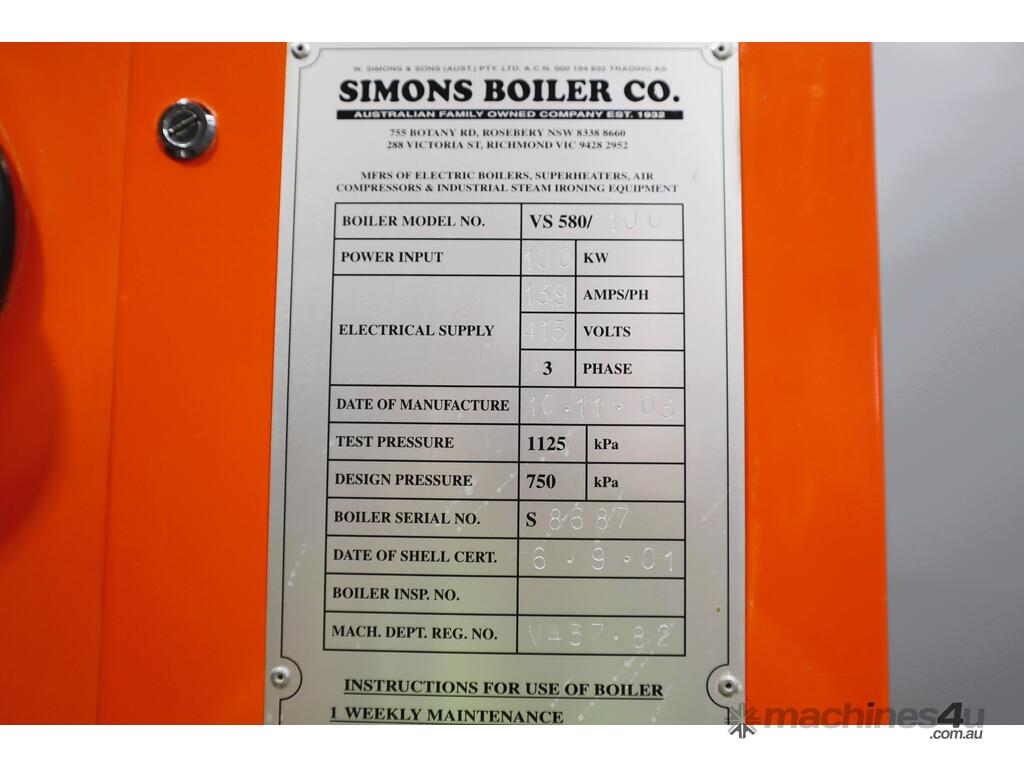 Simons VS 580 electric steam boiler in excellent condition. Australian made heavy duty industrial unit designed for reliable steam generation in commercial and industrial environments. This boiler is rated at 100 kW and well suited to facilities requiring consistent, controllable steam output with minimal combustion related maintenance. Unit presents in solid condition and is fitted with pressure gauge, safety valves, and inspection access.