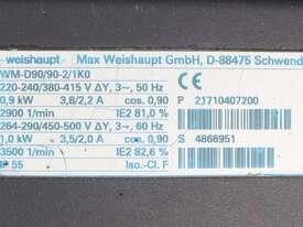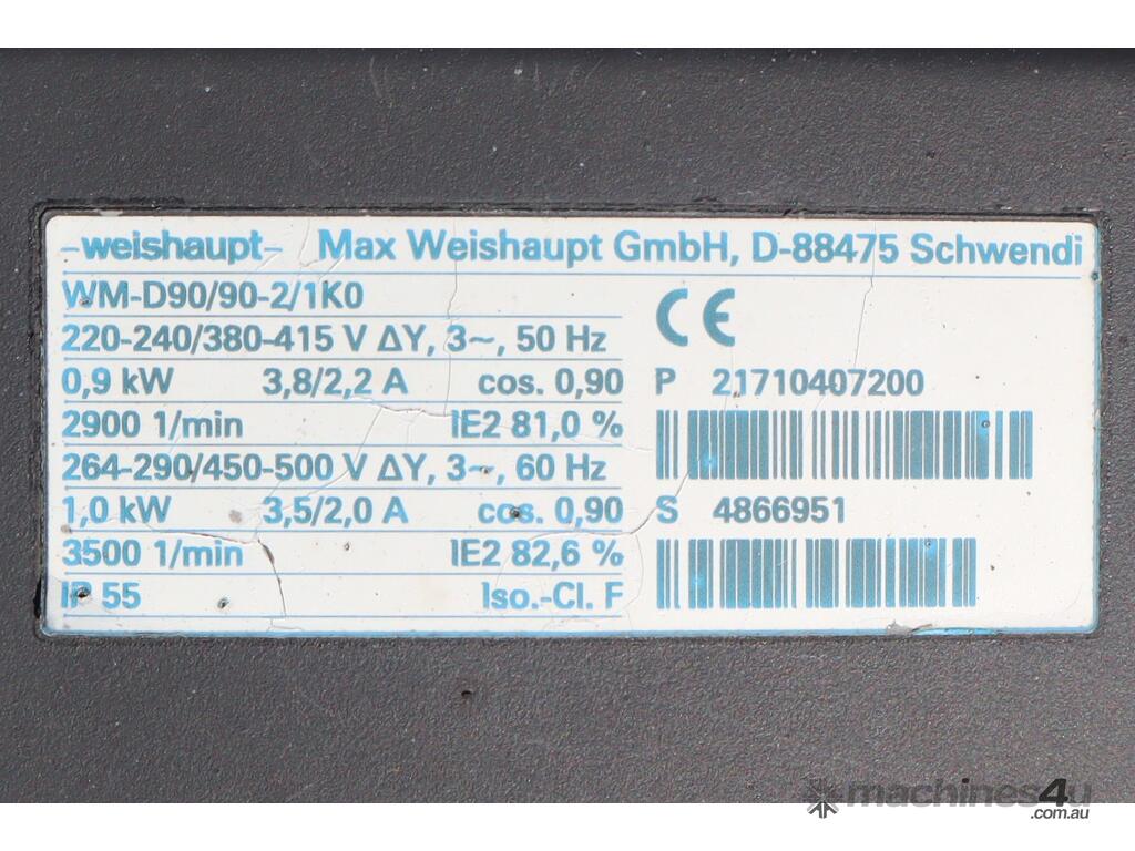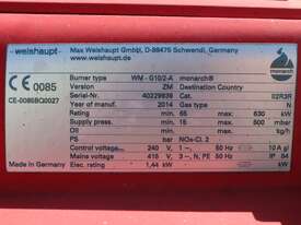 Industrial Weishaupt Monarch WM-G10/2-A ZM burner manufactured in Germany in 2014. Designed for high capacity process heating and industrial combustion applications. Rated from 65 to 630 kW, this burner is configured for natural gas operation, oil or dual-fuel configurations (due to the ZM designation). The Monarch series is widely used in thermal fluid heaters and industrial heating systems where reliable operation and precise combustion control are required.
