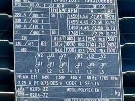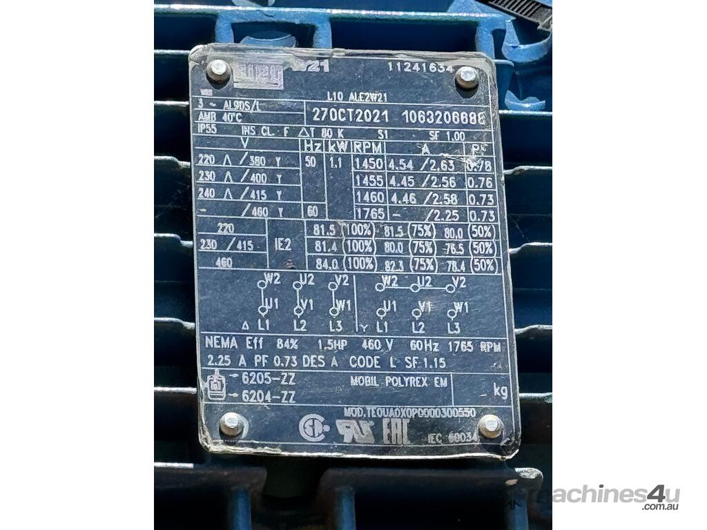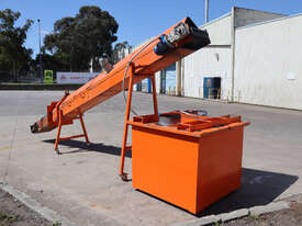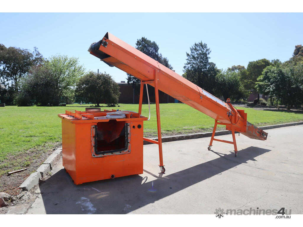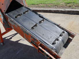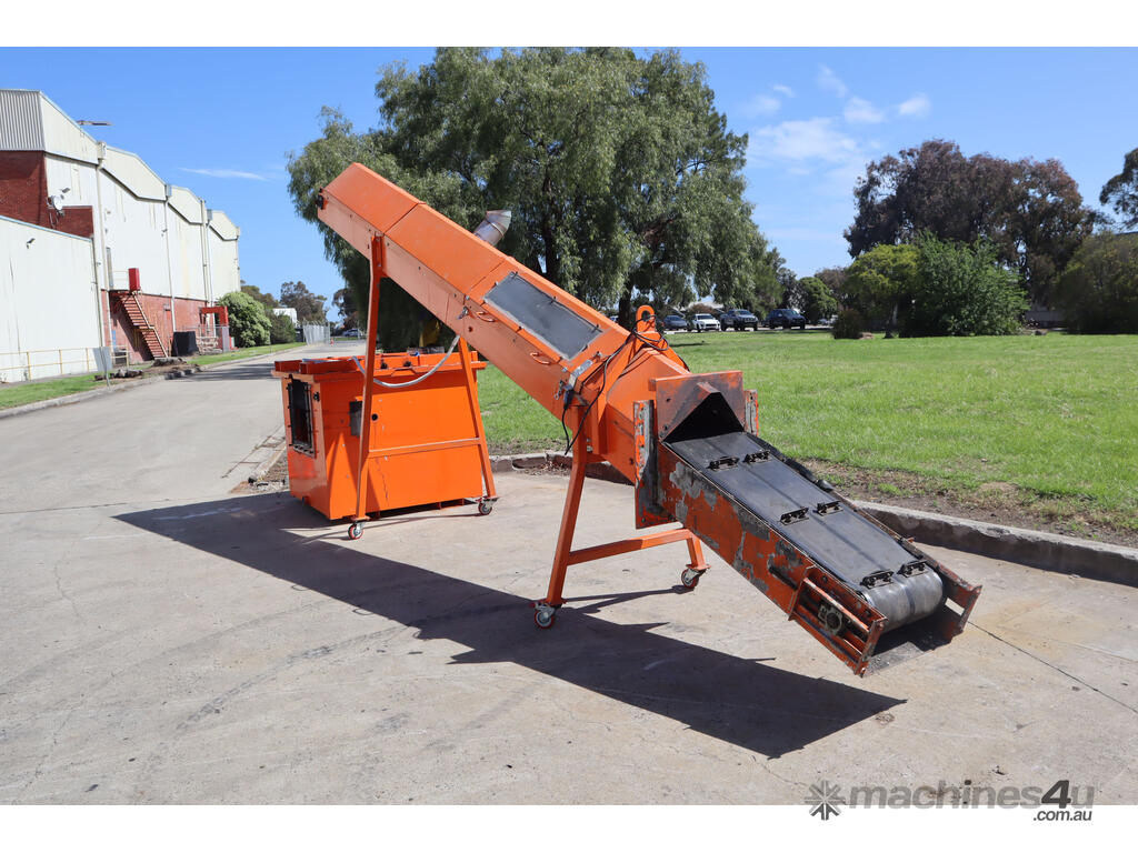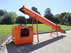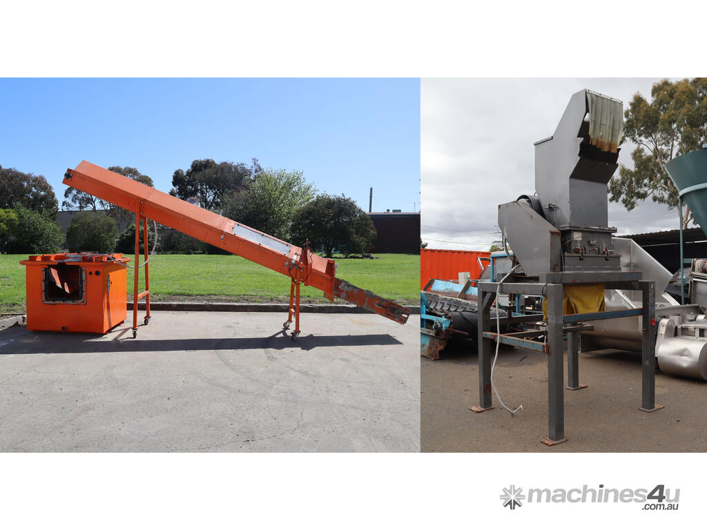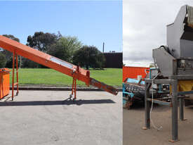 The conveyor was previously used as part of a product destruction line for battery operated items such as vapes and mobile phones. The conveyor features a cleated belt and the hopper is fitted with fire suppression system, intended to assist with cooling and fire risk mitigation during operation. The granulator is powered by an 18.5 kW electric motor and is suited to recycling, waste processing, and material recovery etc.