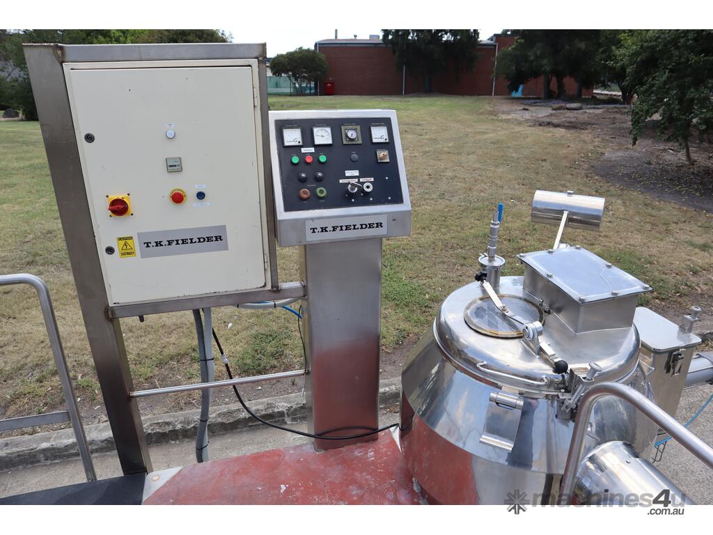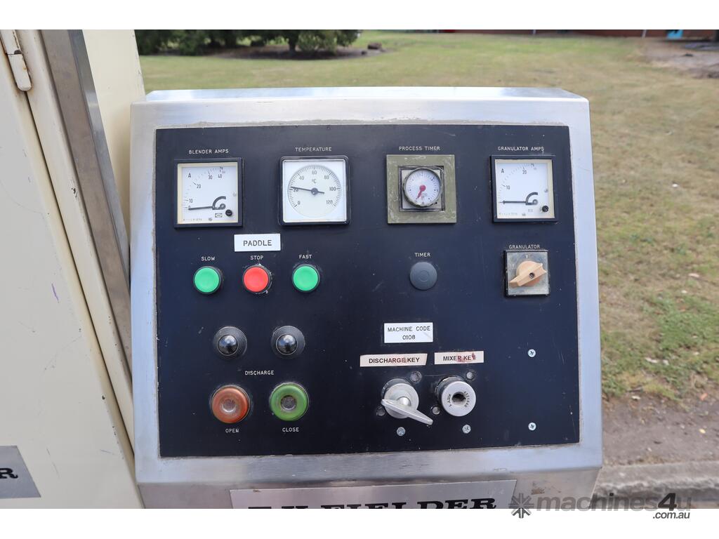 Control panel fitted with analog display for process timer, temperature and ammeter for both granulator and blender. Two speed blender and granulation mixer.