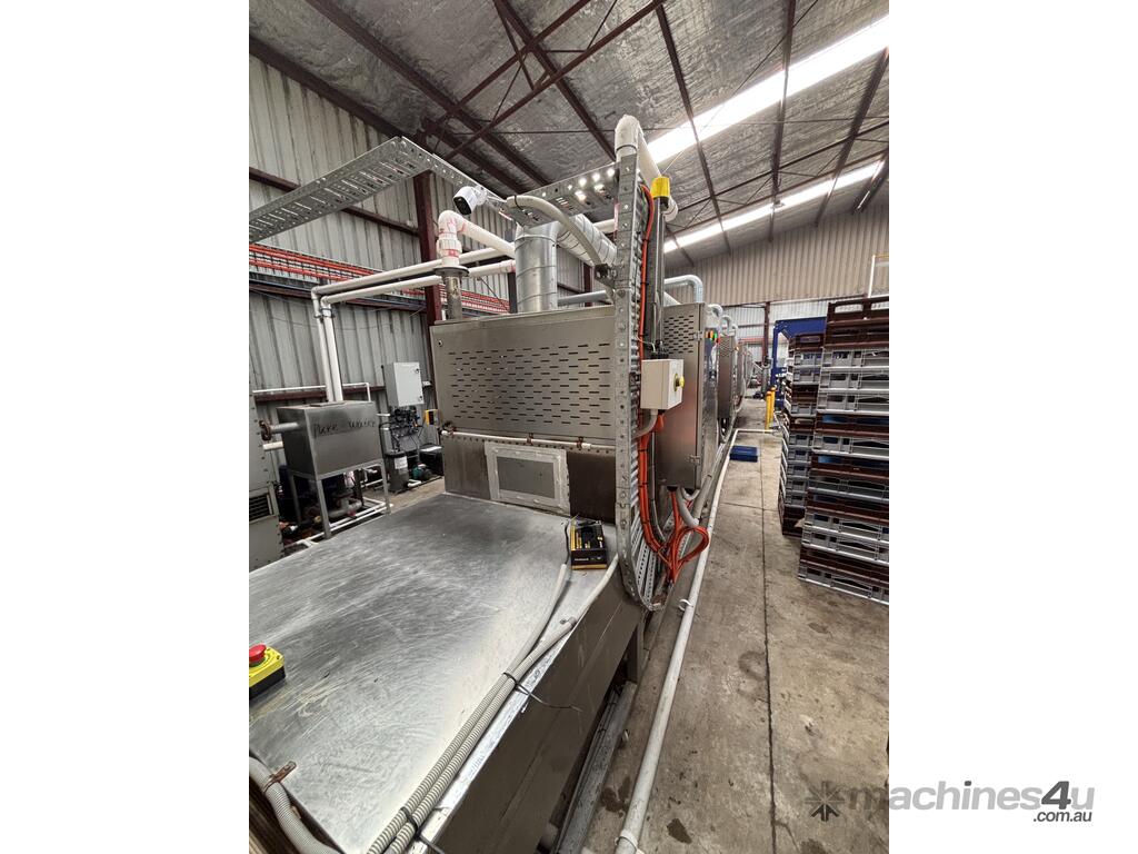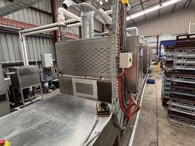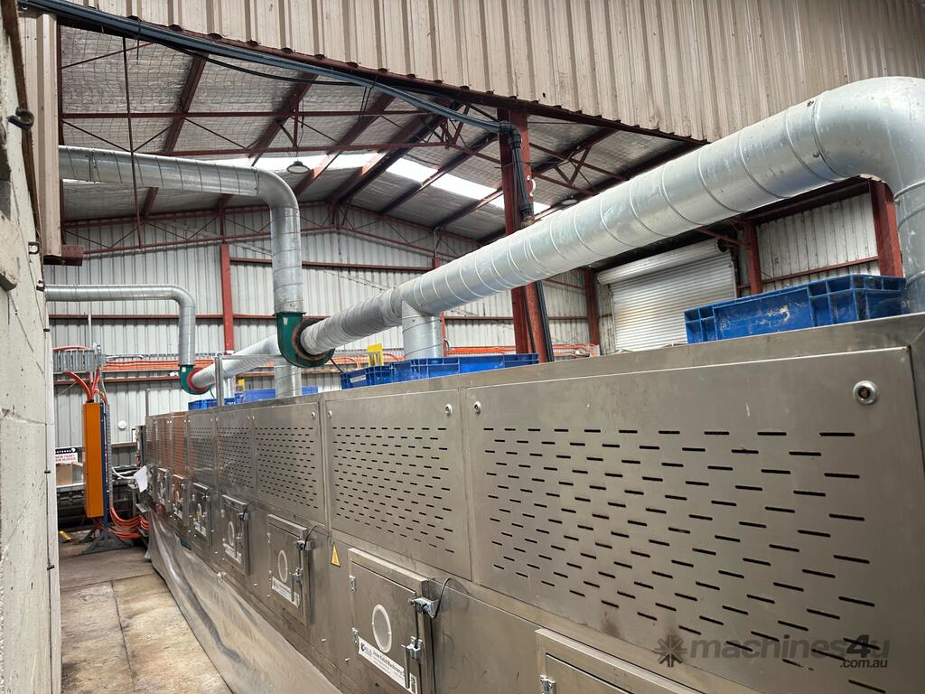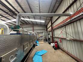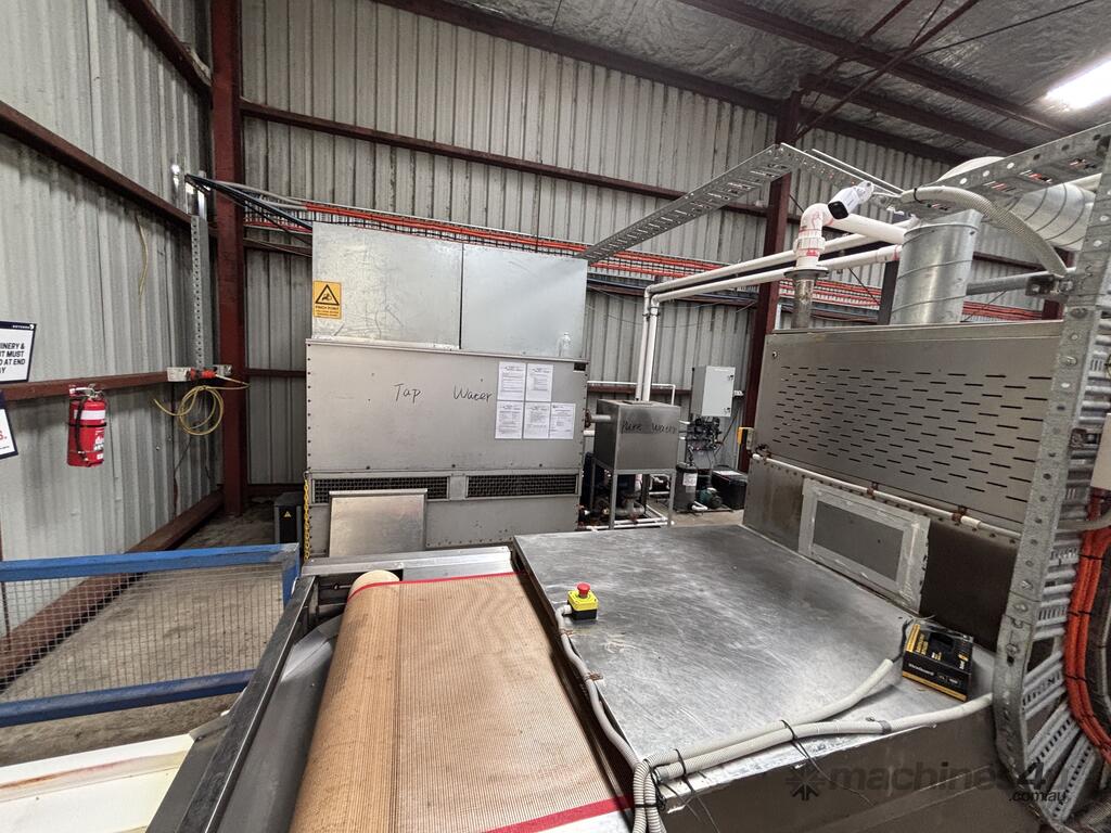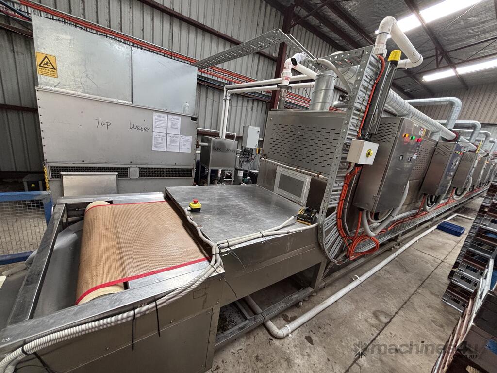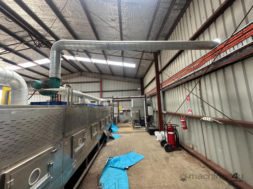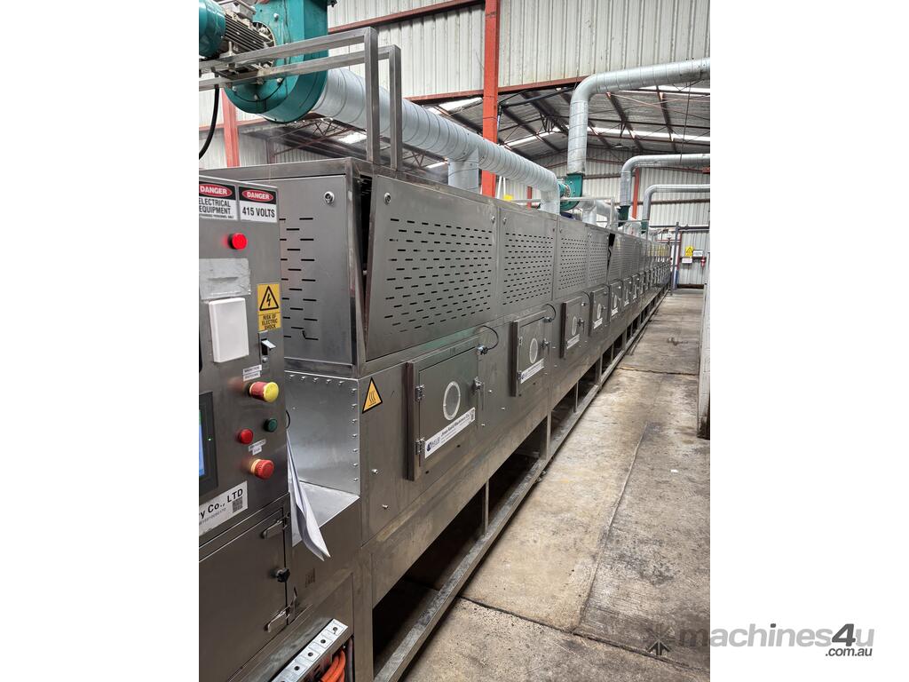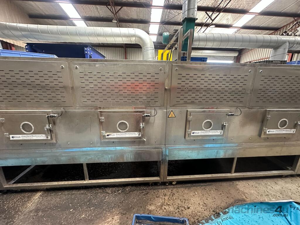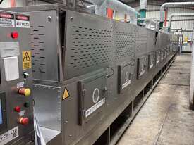 High capacity industrial microwave dryer in excellent condition. Designed for fast, uniform drying and sterilization of food, herbs, powders, and granular materials. Built for continuous operation with a durable stainless steel frame and user friendly PLC control system.