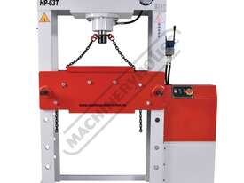 The Metalmaster HP-63T, 63 Tonne electric/hydraulic press is ideal for pressing, bending, forming, straightening and a whole variety of operations. The hydraulic system is equipped with a pressure guage and a joystick lever to control the operation. A heavy one piece steel workplate and a pair of pressing blocks are supplied as standard equipment.