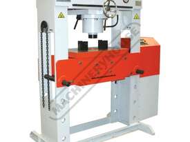 The Metalmaster HPM-150T, 150 Tonne electric/hydraulic press features a sliding cylinder which can be moved from side to side allowing for those offset pressing jobs. A heavy one piece steel workplate and a pair of pressing blocks are supplied as standard making this the ideal press for pressing, bending, forming, straightening and a whole variety of operations.
