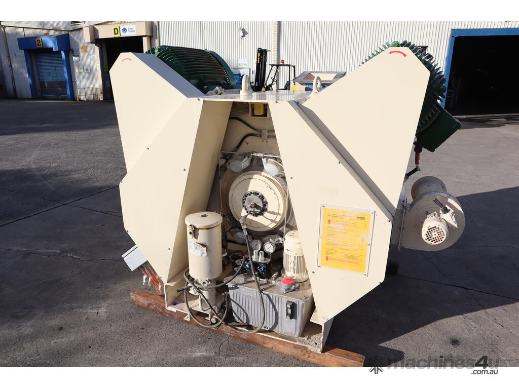 ``The V-belts mounted between the main motor pulleys and the intermediate shaft pulleys are tensioned automatically by means of hydraulic cylinders. The hydraulic system is also used to secure the main shaft with a specially designed brake system. If the main shaft is turned due to overloading, it will require a small amount of downtime to return it to the original position.``