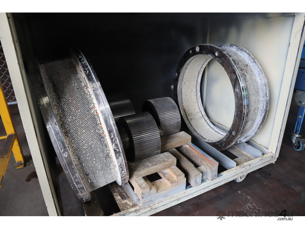 ``All Paladin pelleting chambers are produced in sandwich-like construction, consisting of an outer metal sheet, insulation material, and an inner metal sheet. It is constructed in this particular way in an effort to reduce the noise level of the machine. The inlet has a pneumatically operated bypass that can be used for overload protection as well. Each Paladin is equipped as standard with an adjustable knife assembly. The roller head is either in 2- or 3-roll design, depending on the application. Based on 40 years of experience, the design of the front-plate has resulted in a system with deflectors to ensure optimum feed distribution.``