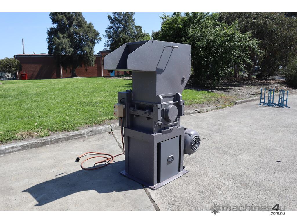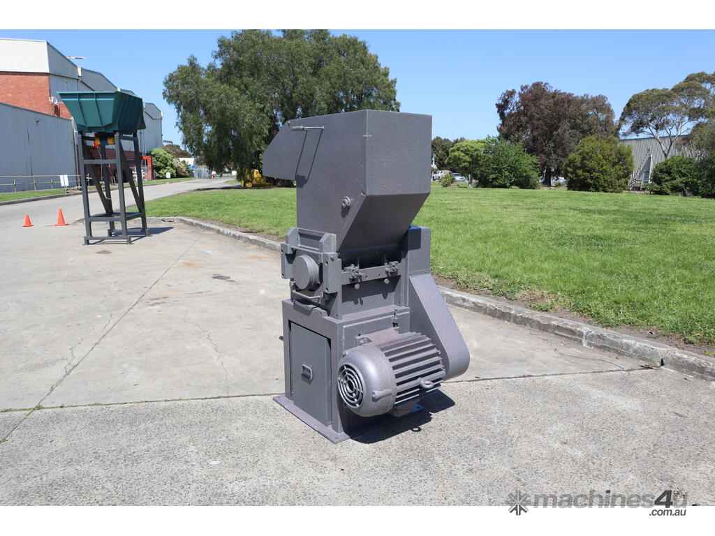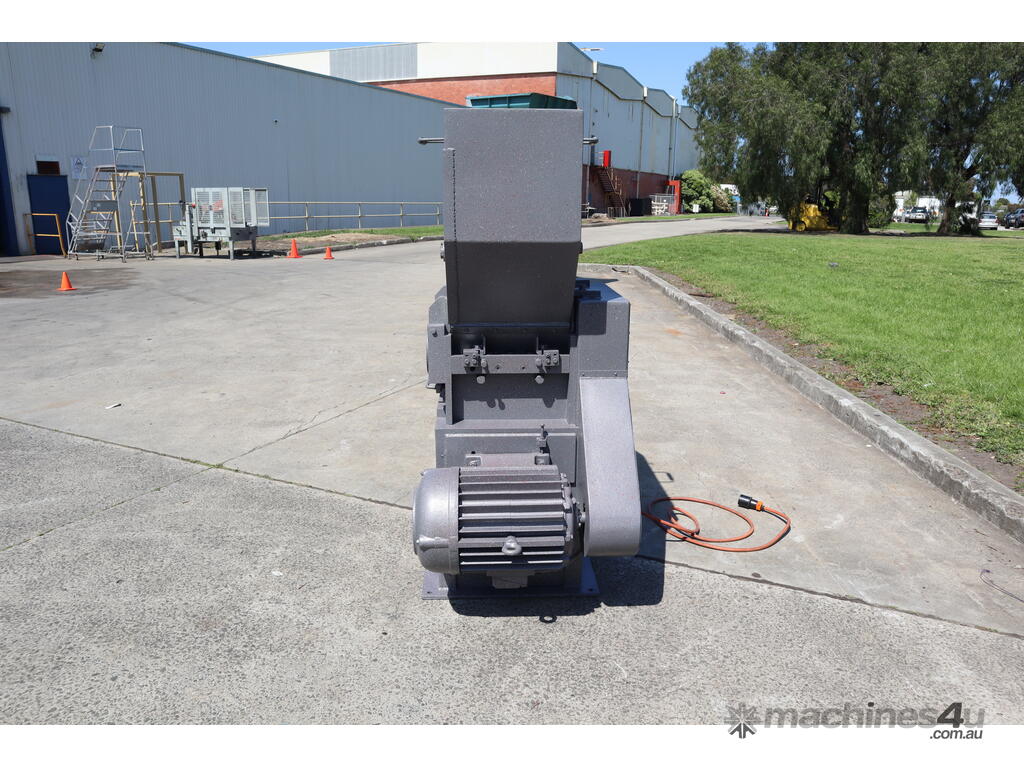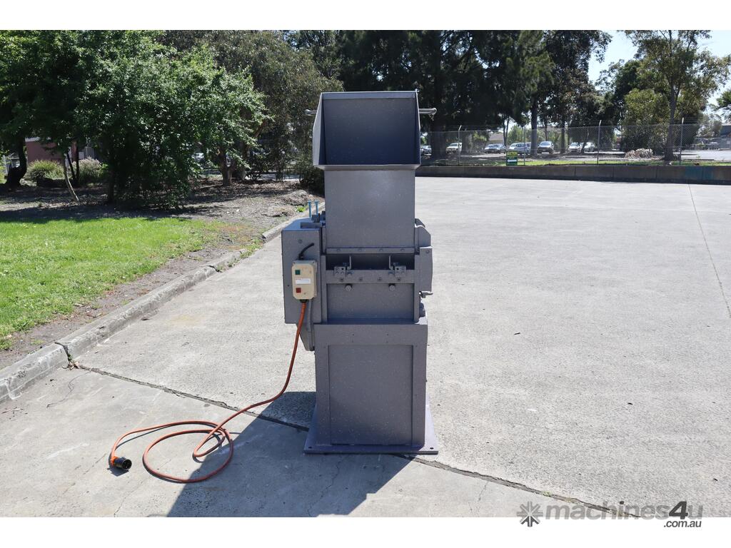 "This industrial granulator may be used in material processing applications, particularly in industries such as recycling, waste management, and manufacturing. It may be employed for reducing the size of various materials like plastics, wood, and soft metals. Businesses looking to improve recycling efficiency and manage bulk material reduction may benefit from the granulator. The granulator functions by feeding materials through its hopper into rotating blades that break them into smaller, manageable sizes."