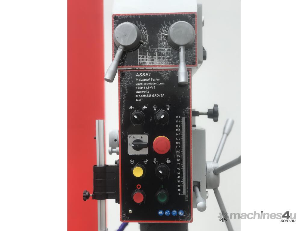 SM-GPD45A. Geared Head Drill with Power Feed & Coolant. Geared Drive. Digital Depth Display Heavy 150mm Column, 4 MT Spindle, 560mm x 560mm Table, 50 ~ 1450 (18) Speeds, 350mm Throat. V.