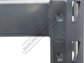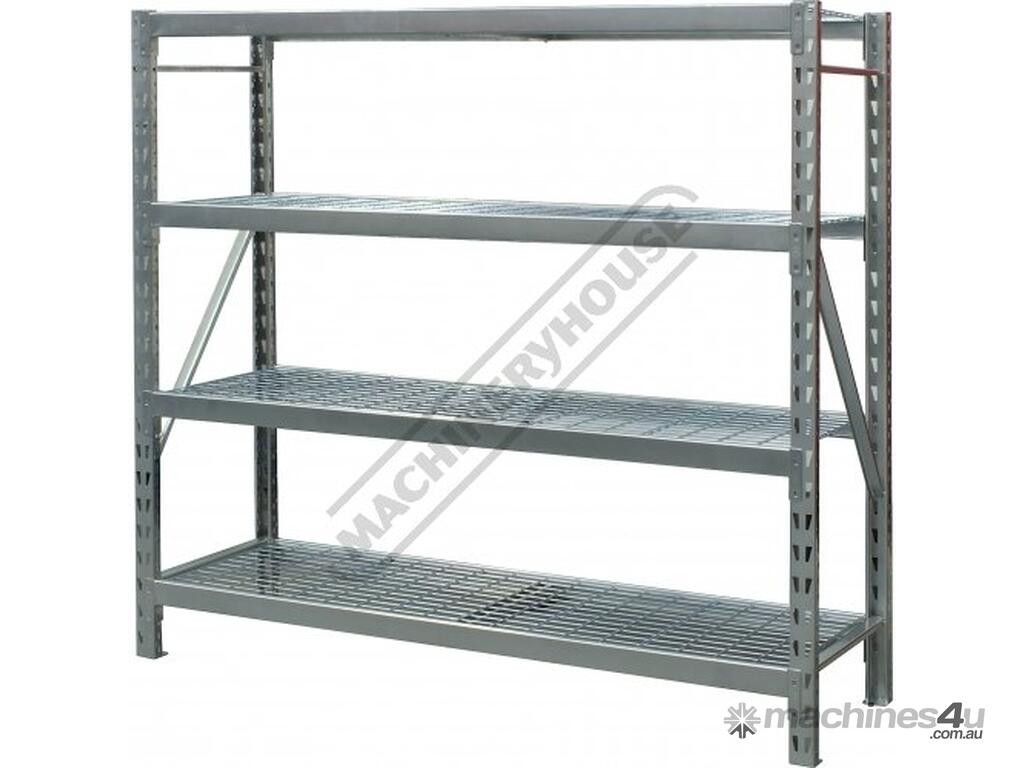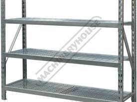 Industrial steel shelving which is supplied in bays 1955mm (L) x 610mm (W) x 1830mm (H) with a silver corrosive resistant powder coated finish.