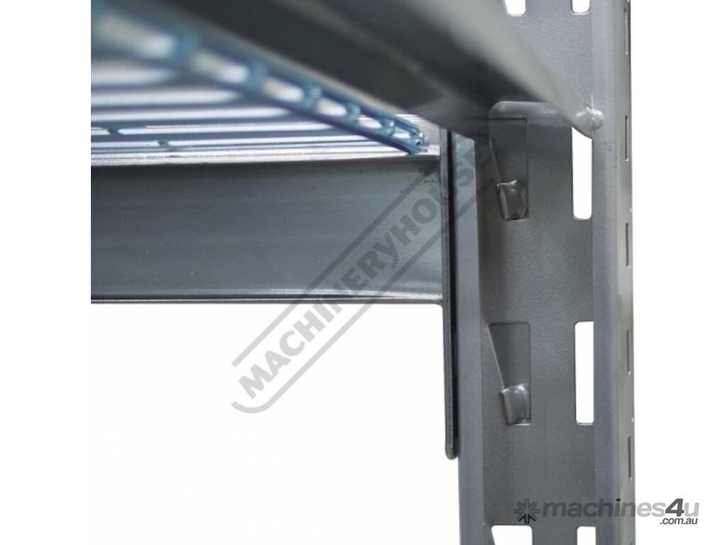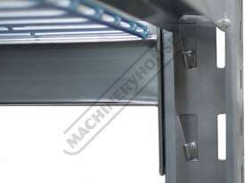 Each bay consists of four levels with wire mesh inserts, each shelf has a capacity of 364kg. The vertical posts have provision to adapt an optional racking extensions (S014A) to double the storage. The shelf rails are secured in position and locked in via a wedge system. Simply very easy to assemble without the use of any tools.