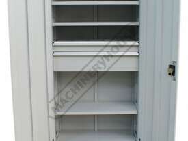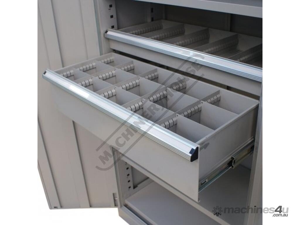 This cupboard comes standard with 4 shelves, 1 x 100mm deep drawer & 1 x 200mm with all being adjustable allowing you the ability to set up the positions of the shelves or the drawers to suit your application, optional extra drawers & shelve packs are available for further customisation.