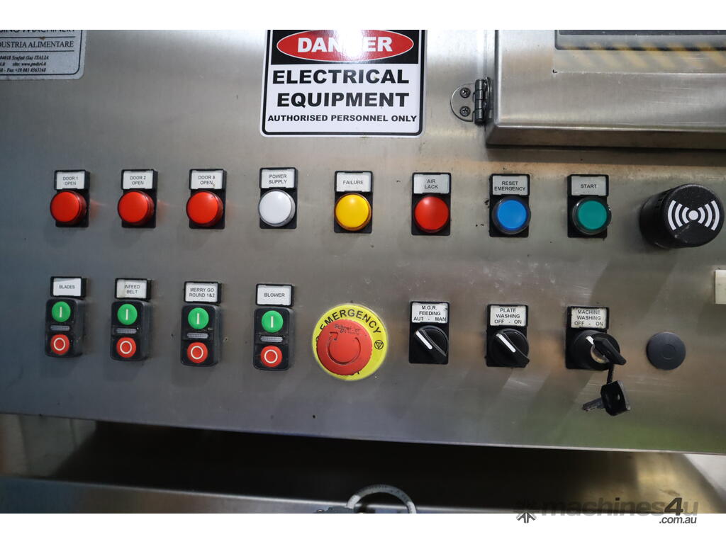 ``The standard model includes a merry-go-round infeed conveyor belt that allows operators to always have product available for loading. The product is placed manually in the special fruit holders that rotate continuously, taking the product to the process stations. The processing takes place in three phases: the alignment of the product; the destalking and the ejection of the fruit (which may coincide with the cutting phase, if requested by the customer).``