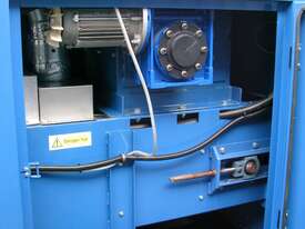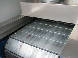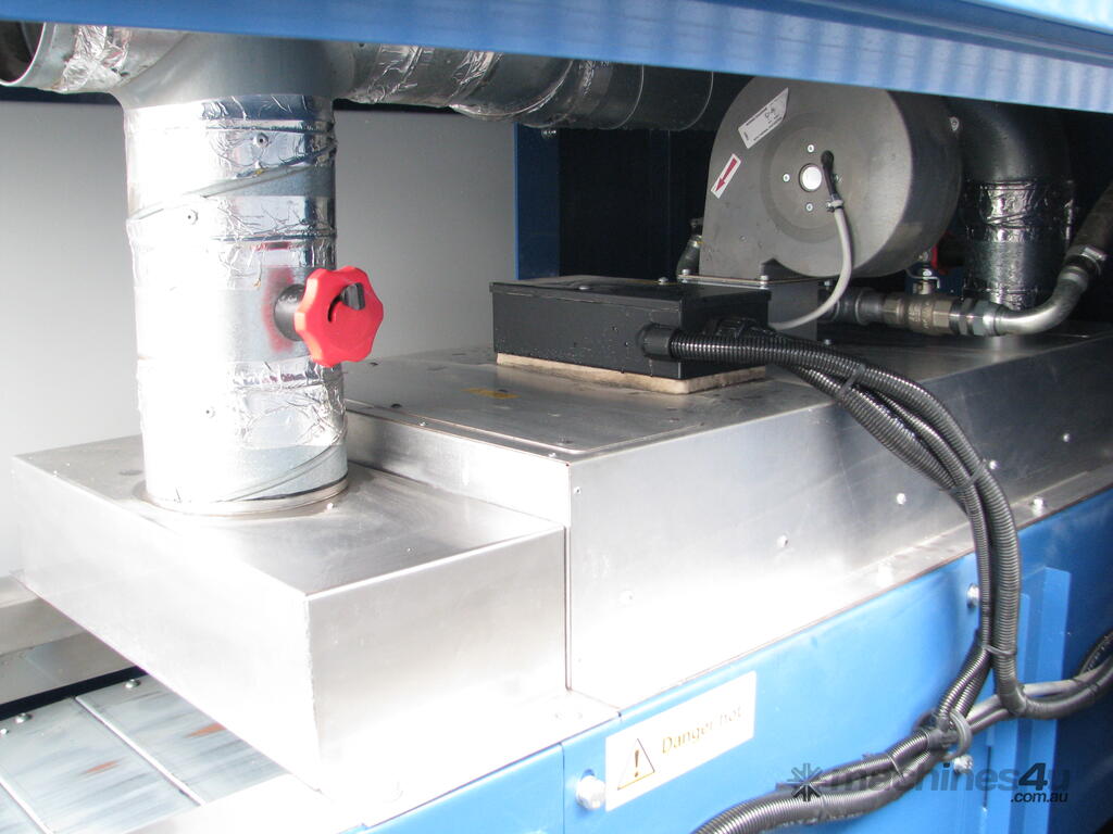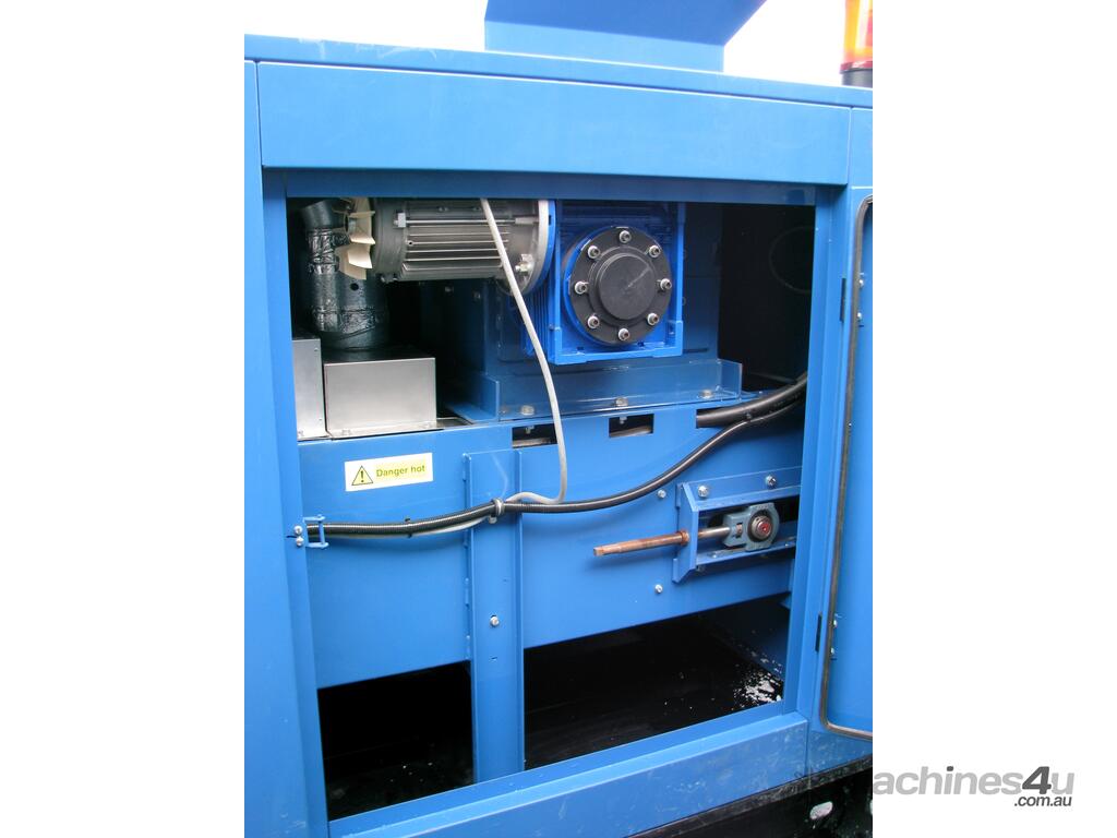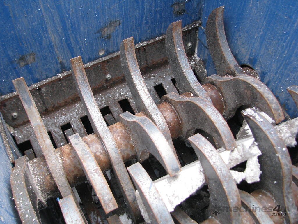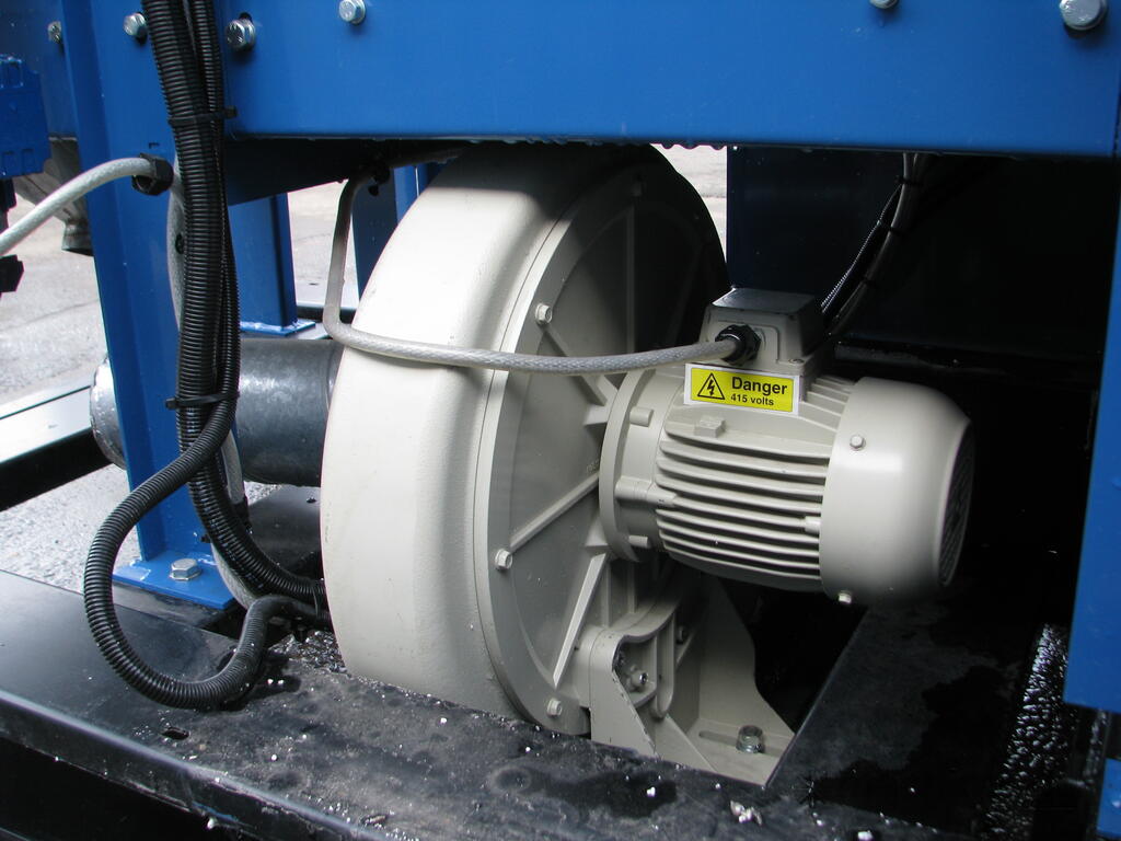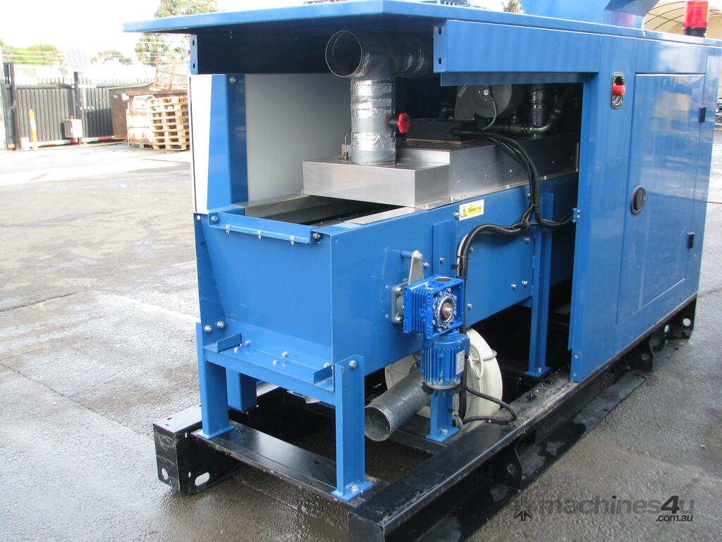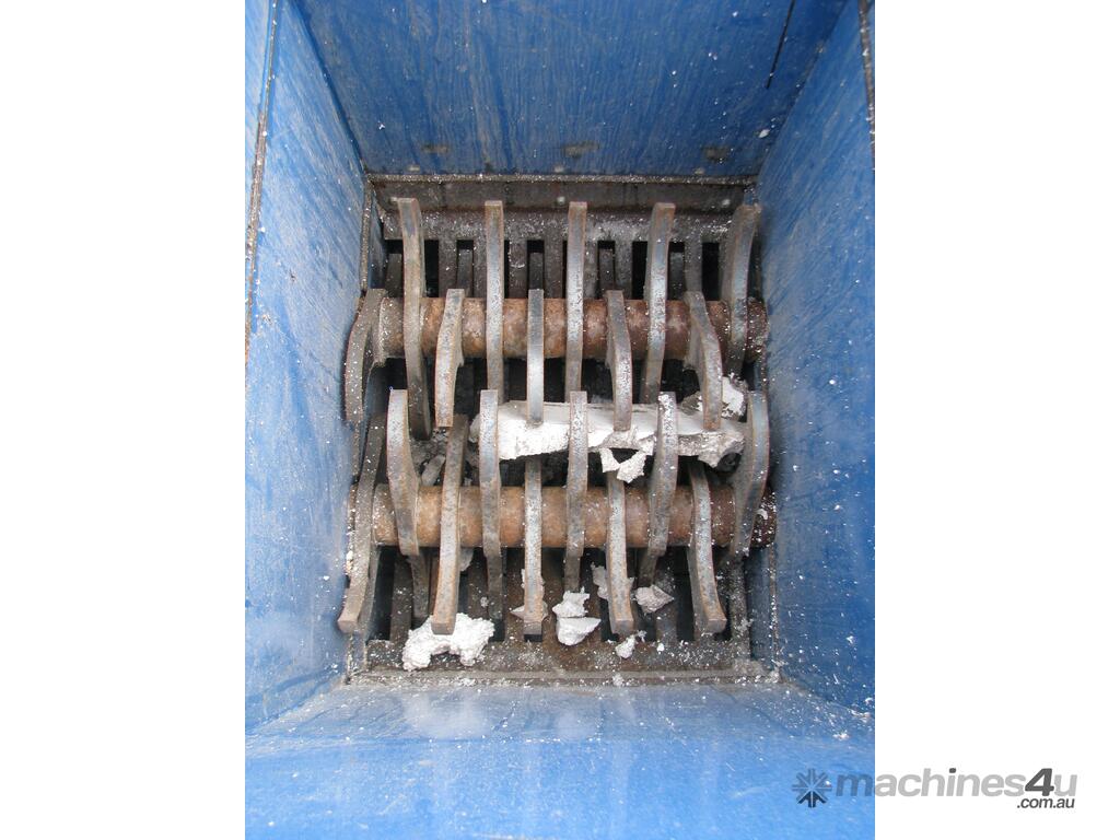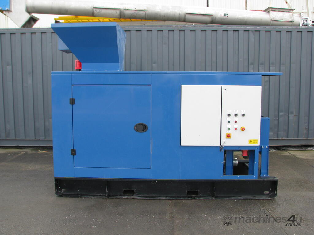 It has a conveyor, heater and a blower built-on. The blower is used to move the shredded pieces through a pipe.