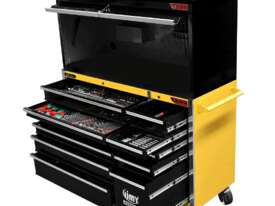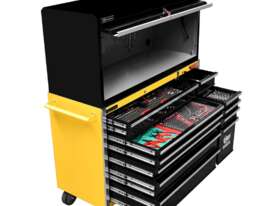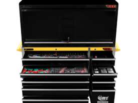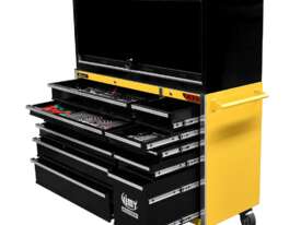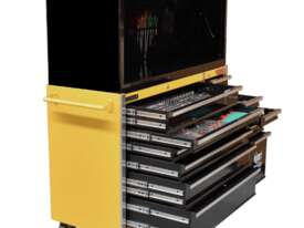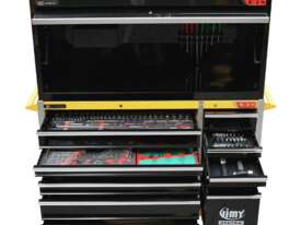 The 11 drawer “Intermediate" hutch tool workshop from Jimy Tools offers a great range of tools for the professional mechanic. The kit consists of a hutch top box and an 11-drawer roller cabinet, all have been powder coated with a tough industrial finish, 1.2mm thick steel, fully lockable with rear internal locking system, dual gas strut system for the hutchandball bearing slide drawers with twin slides on the deeper drawers.
