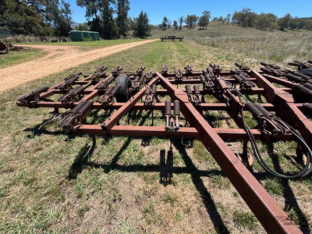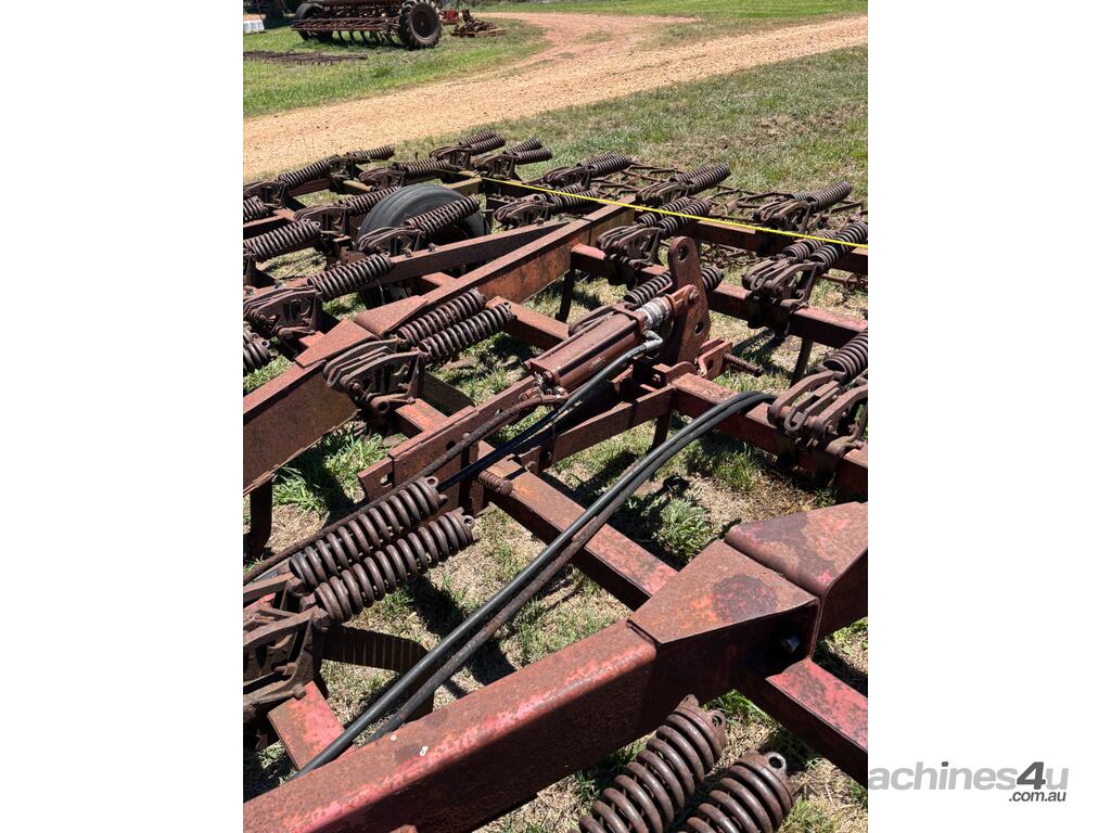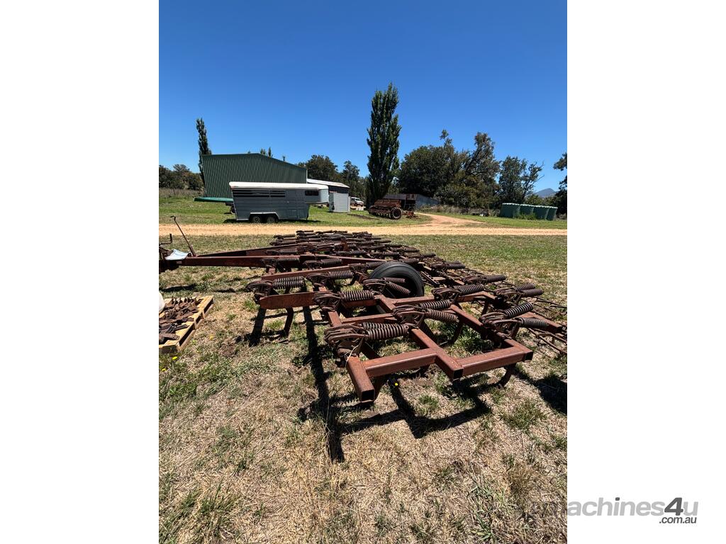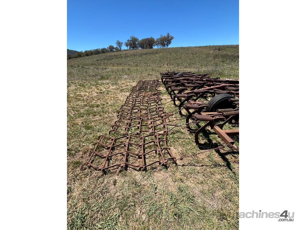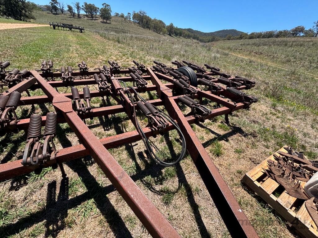 International Scarifier, 41 tynne 10" points, heavy set trailing harrows, 7m operating width. Will need to be broken down to be transported, tractor available for lifting.