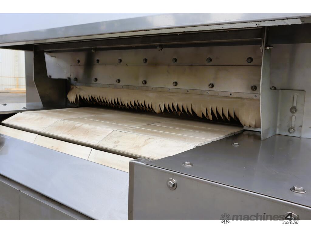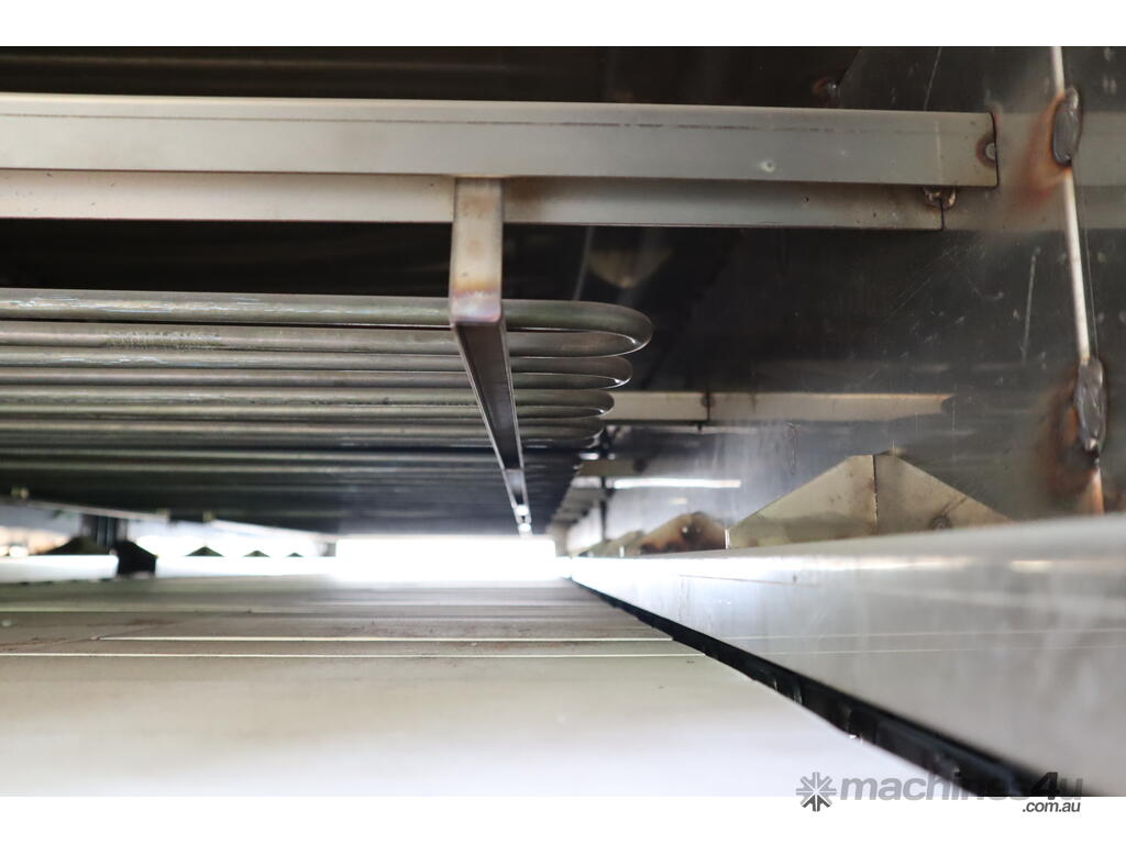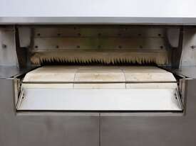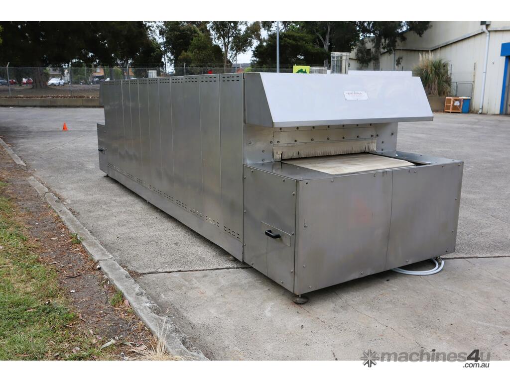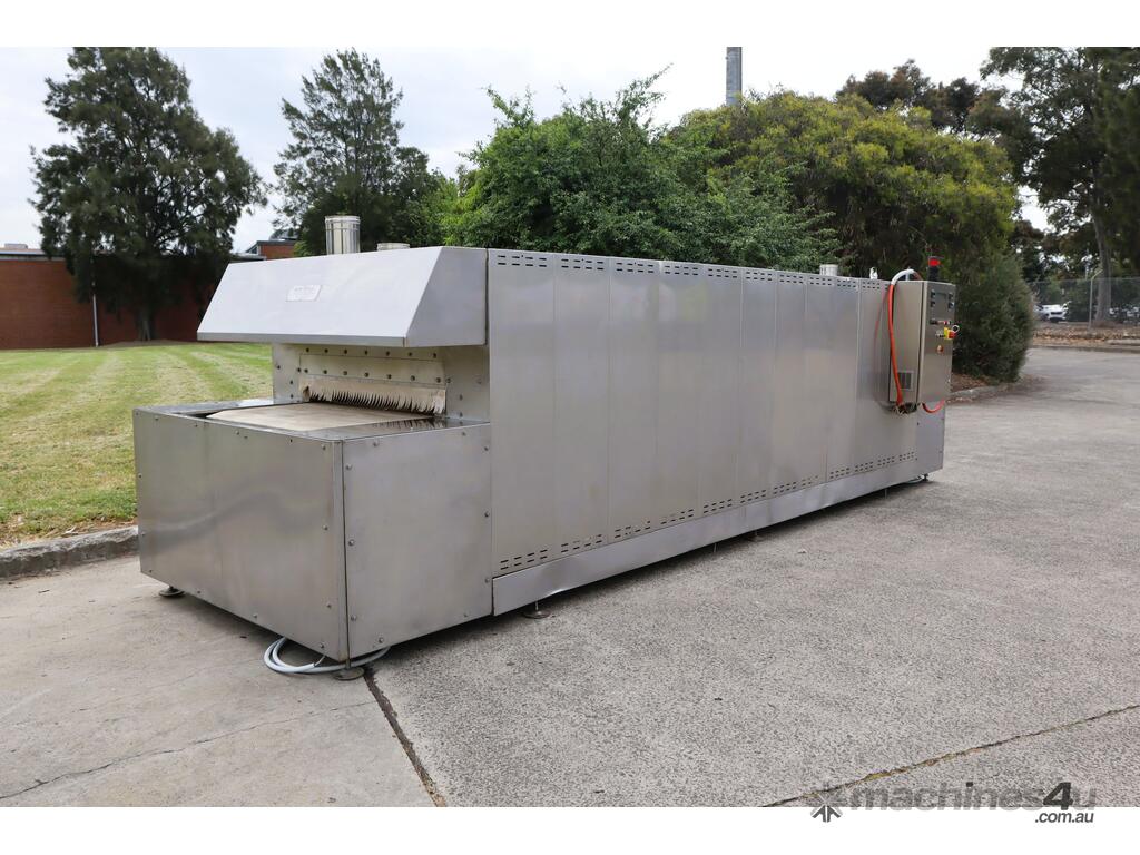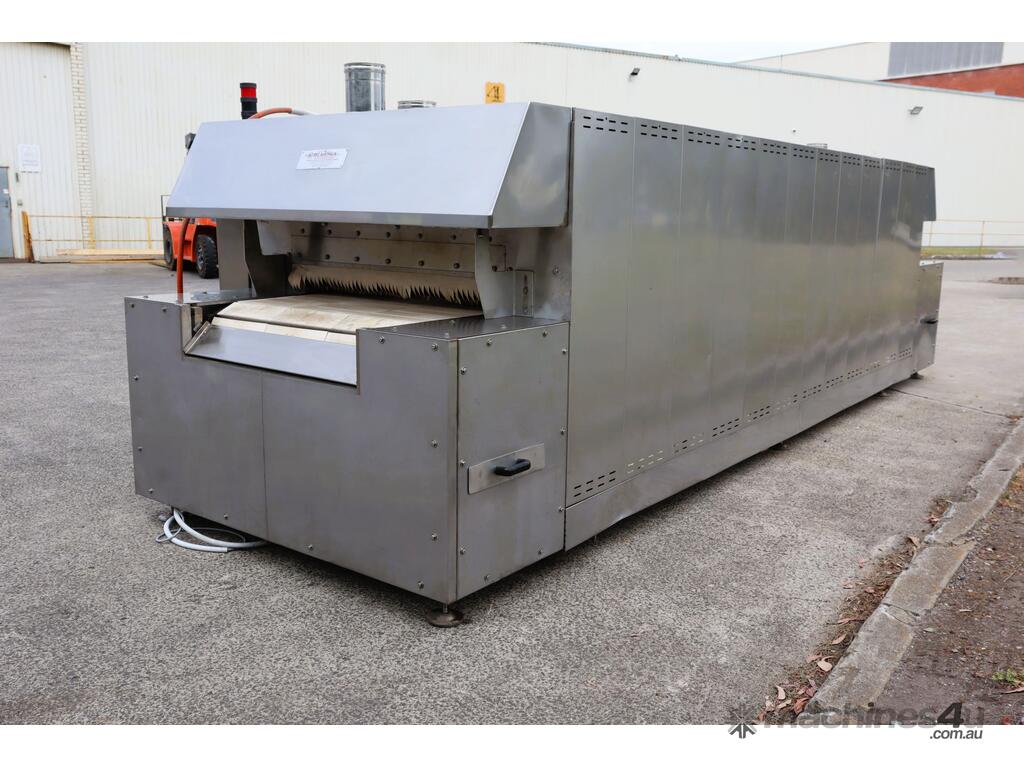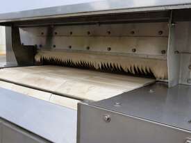 Industrial stainless steel conveyor oven for continuous pizza production and other baked goods.