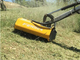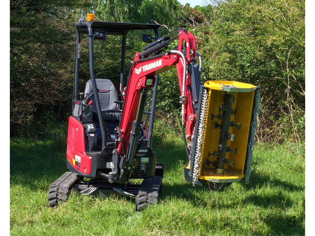 It is a symmetrical flail mower/mulcher, with identical input and output mouths, slew the excavator both directions and mulch vegetation into the ground. No need to clear left over sticks and branches afterwards.