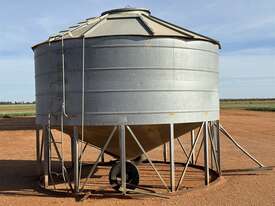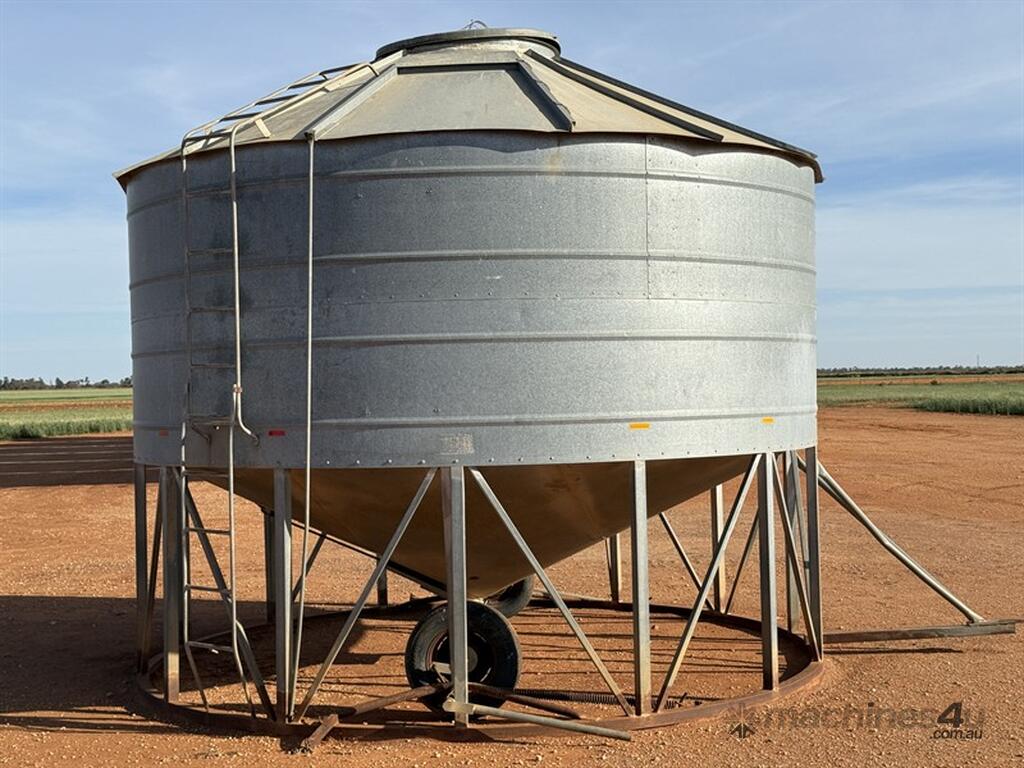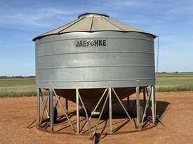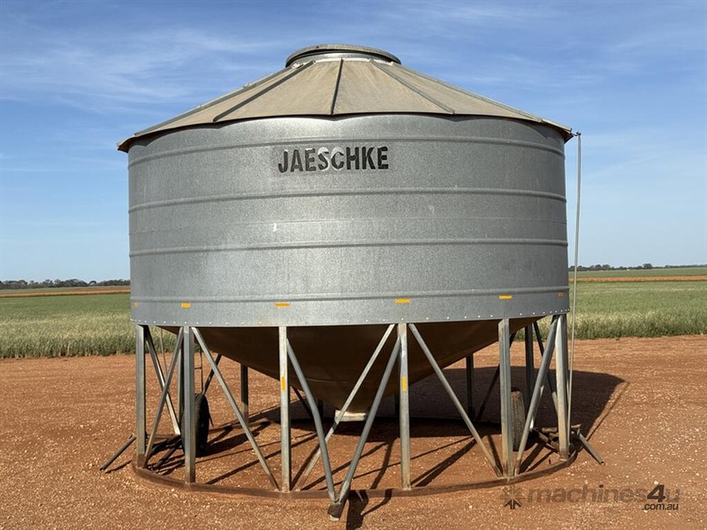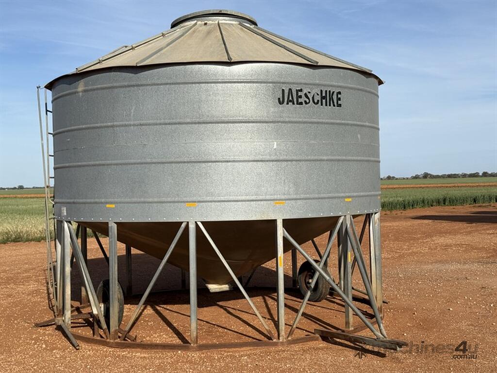 JAESCHKE 30T Field Bin. Manually operated transport wheels, one assist spring missing. Large diameter delivery point in top of bin with side ladder to access. Two side delivery points with handles to operate from ground. Manhole inspection point under bin. Well built bin in good condition. Located Carrathool NSW.