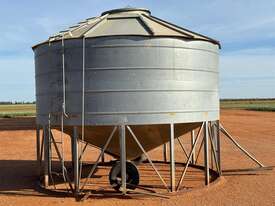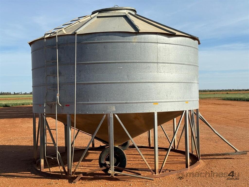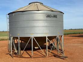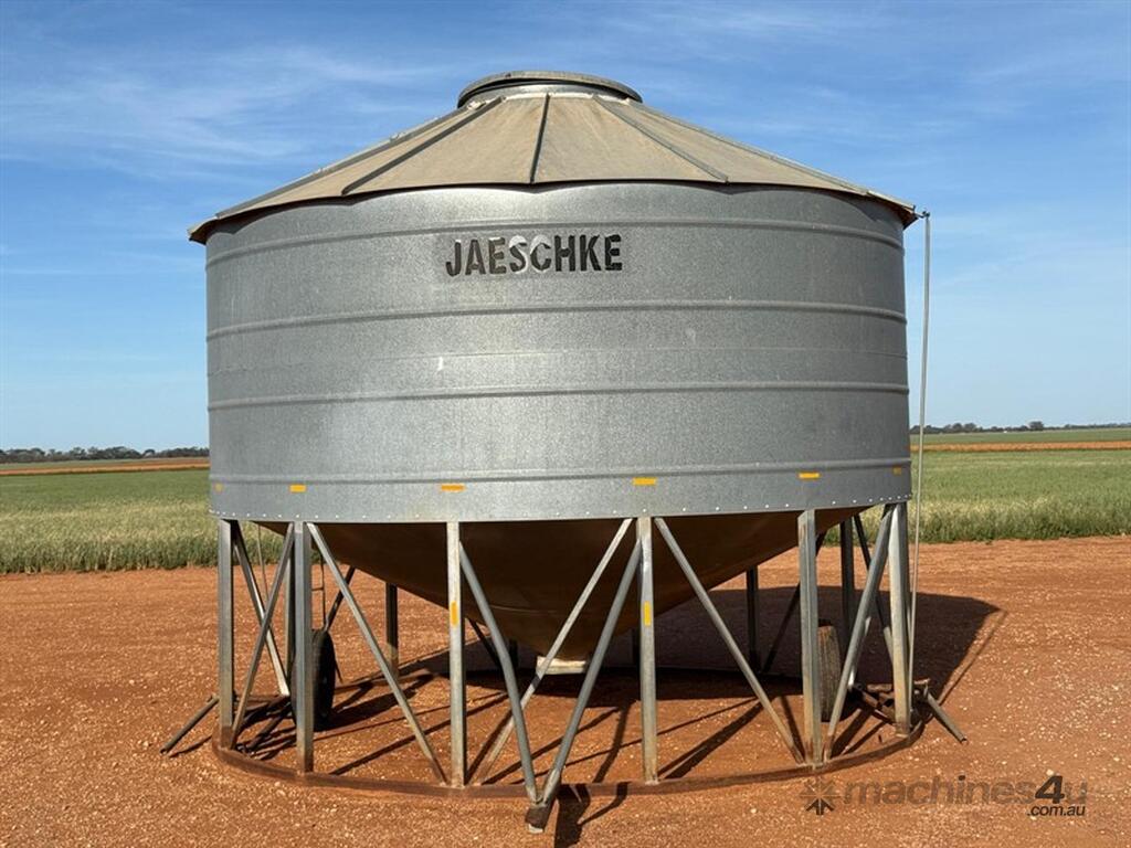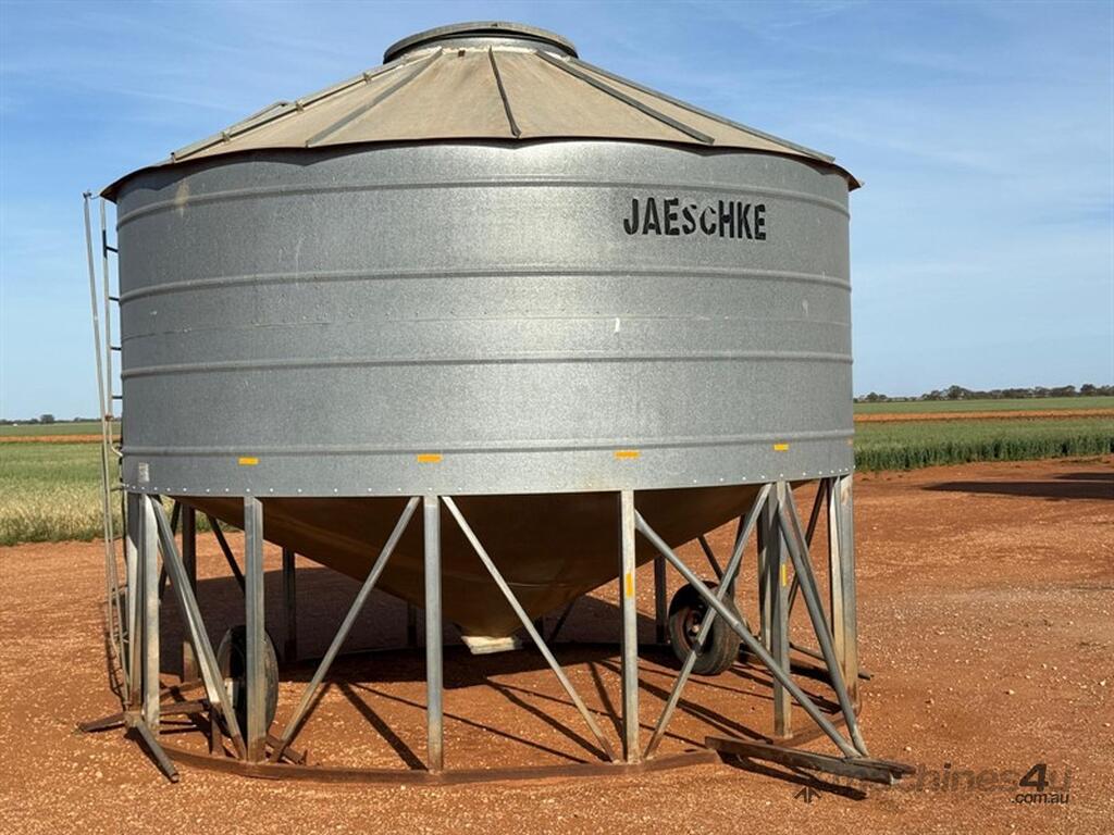 JAESCHKE 30 TONNE FIELD BIN. Manually operated transport wheels, one assist spring missing. Large diameter delivery point in top of bin with side ladder to access. Two side delivery points with handles to operate from ground. Manhole inspection point under bin. Well built bin in good condition. Transport width 4.7 metres. Located Carrathool NSW.