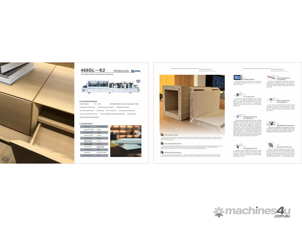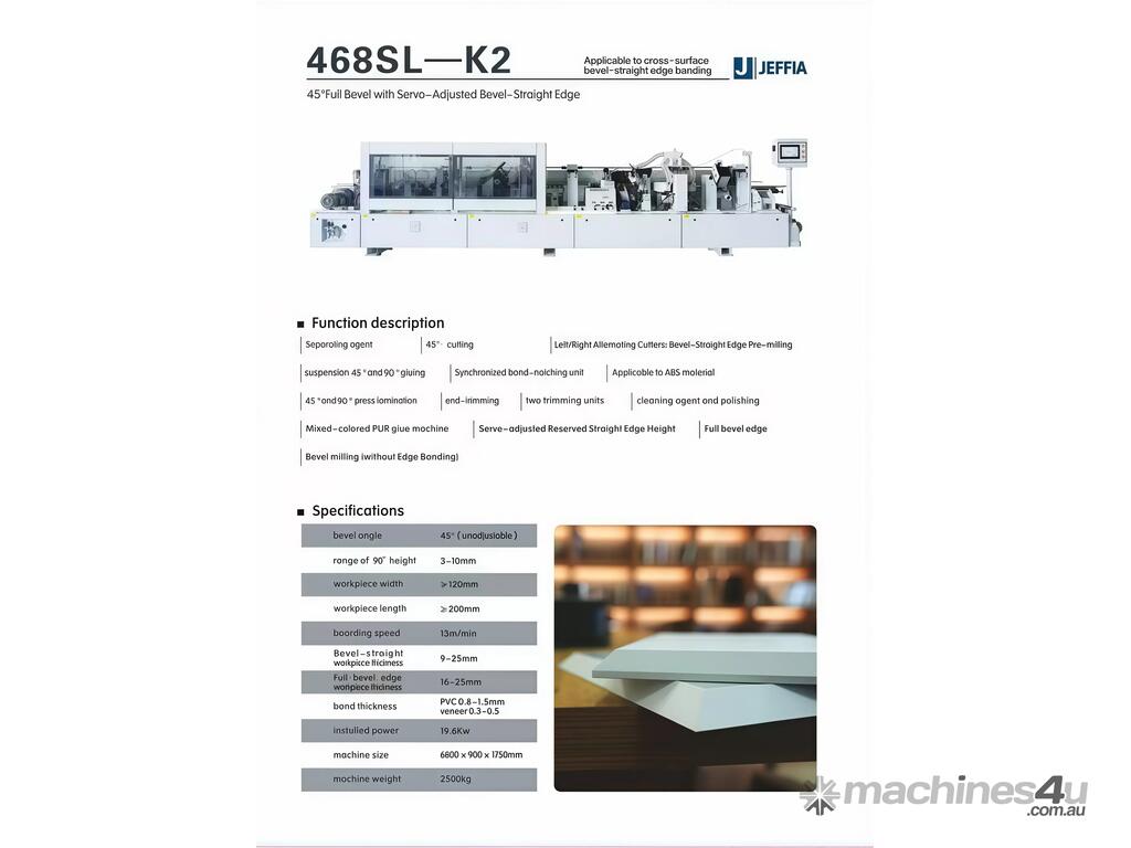 For sale: JEFFIA 468SL-K2 45° Full Bevel Edge Banding Machine, designed for high-quality bevel-straight edge banding applications.