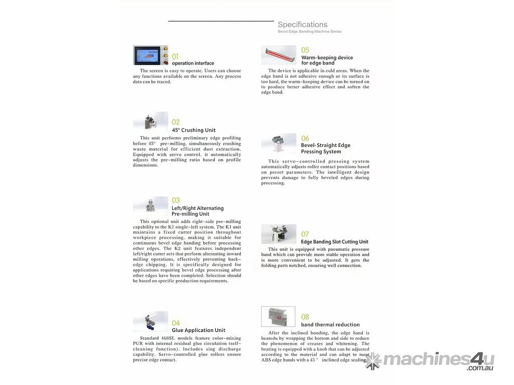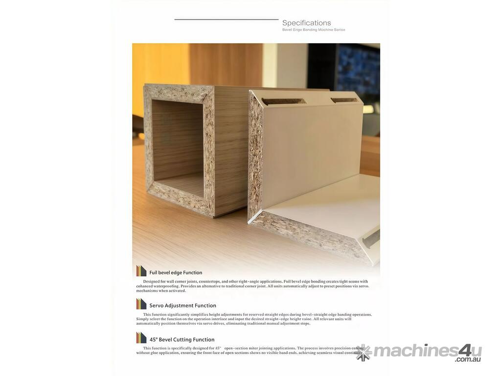This machine is suitable for cabinet making, furniture production, joinery workshops, and panel processing businesses requiring clean, precise bevel edge finishing. It is designed for cross-surface bevel-straight edge banding and supports full bevel edge processing with servo-adjusted straight edge height.