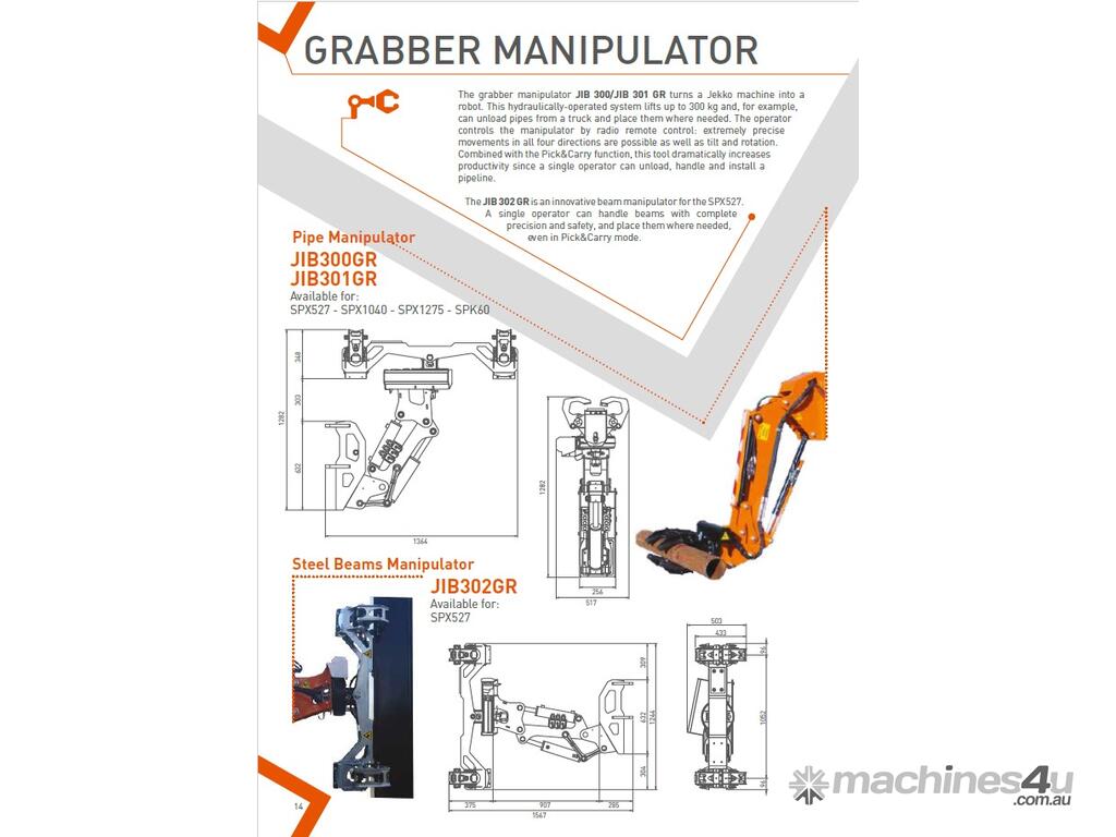 The grabber turns a Jekko machine into a robot to use on site. This hydraulically-operated system lifts up to 300 kg and can, for example, unload pipes from a truck and place them where needed. The operator controls the manipulator via the machine radio remote control: extremely precise movements in four directions are possible as well as inclination and rotation. Combined with the Pick & Carry function, this tool dramatically increases productivity since a single operator can unload, handle and install a pipeline.