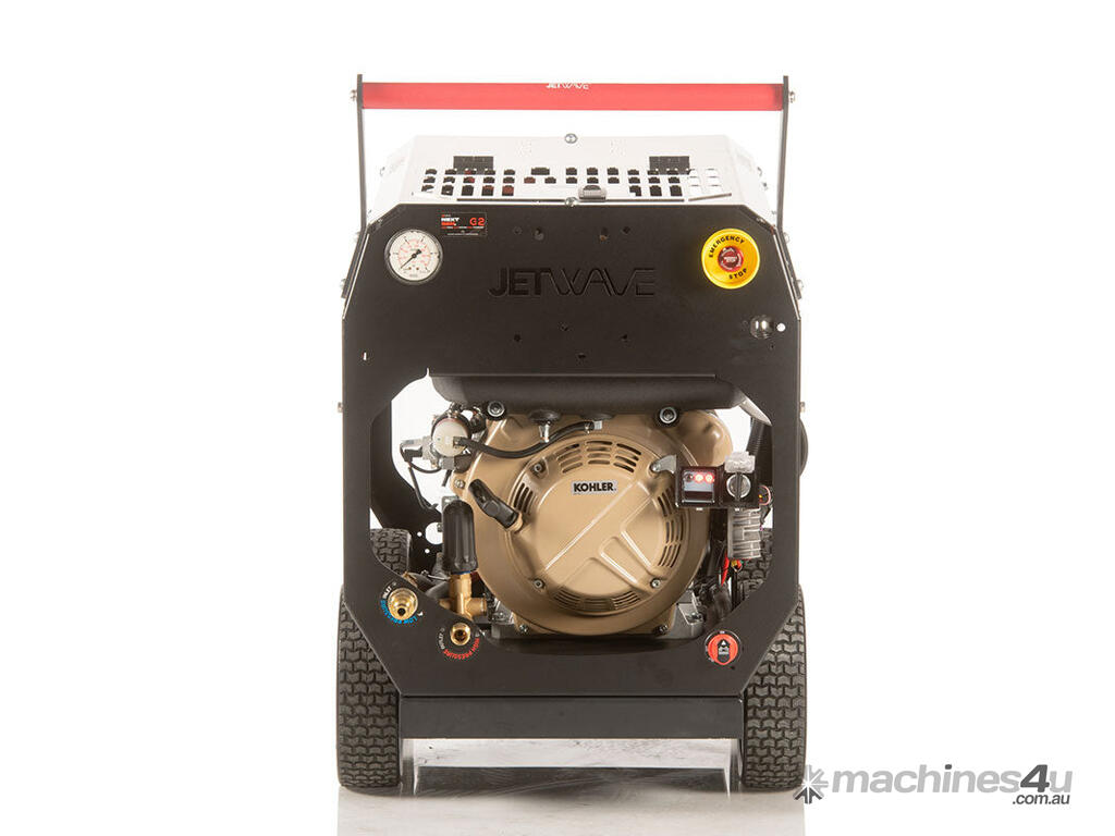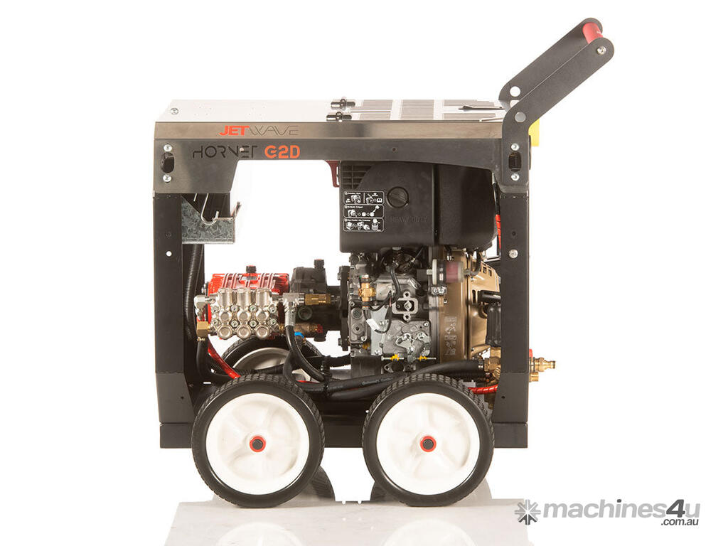 The Jetwave® Hornet G2D™ revolutionises the single cylinder gearbox diesel driven cold water high pressure cleaner powered by KOHLER™ Australian engineered and assembled; its innovation provides heavy duty users with a compact powerful, safe and easy to use unit that encompasses stainless steel exoskeleton (PEXO™) cover protection, centralised control & multi-configurable design.