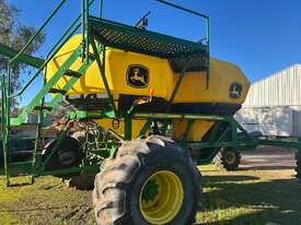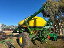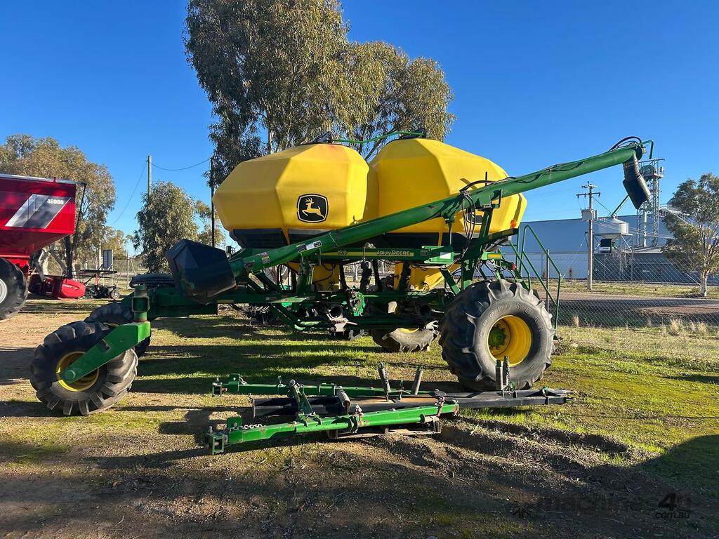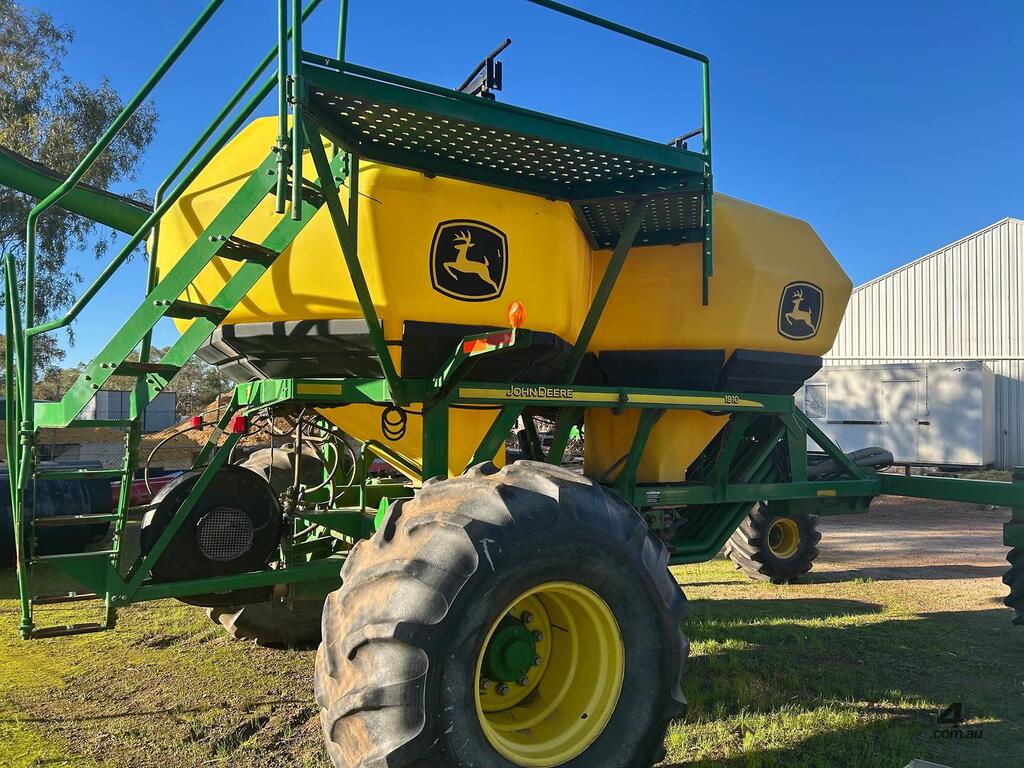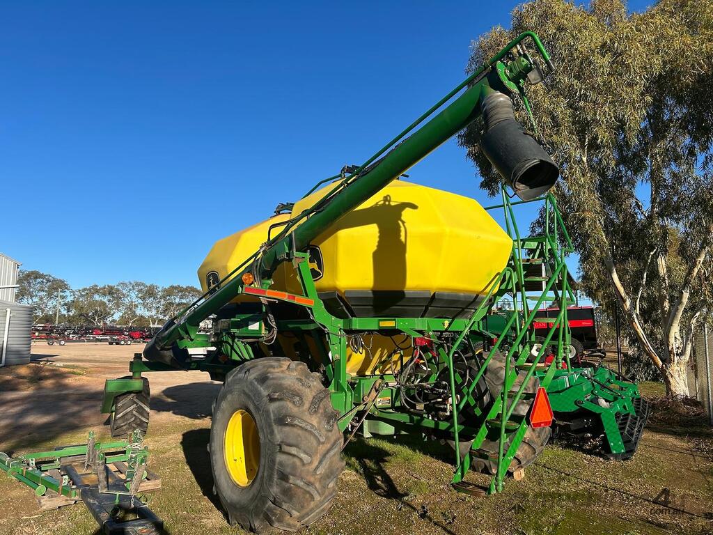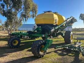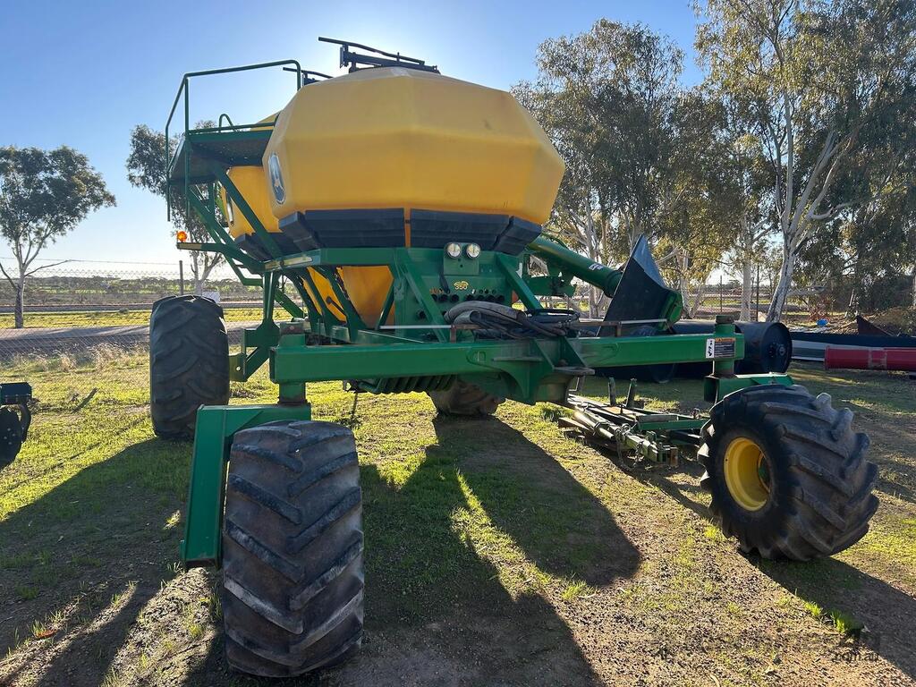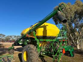 John Deere 1910 tow behind air cart, 2 bin with 150bu/200bu splits, near new fan, plastic tanks, comes with hitch, 8" load/unload auger & stainless steel metering.