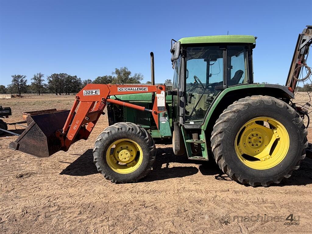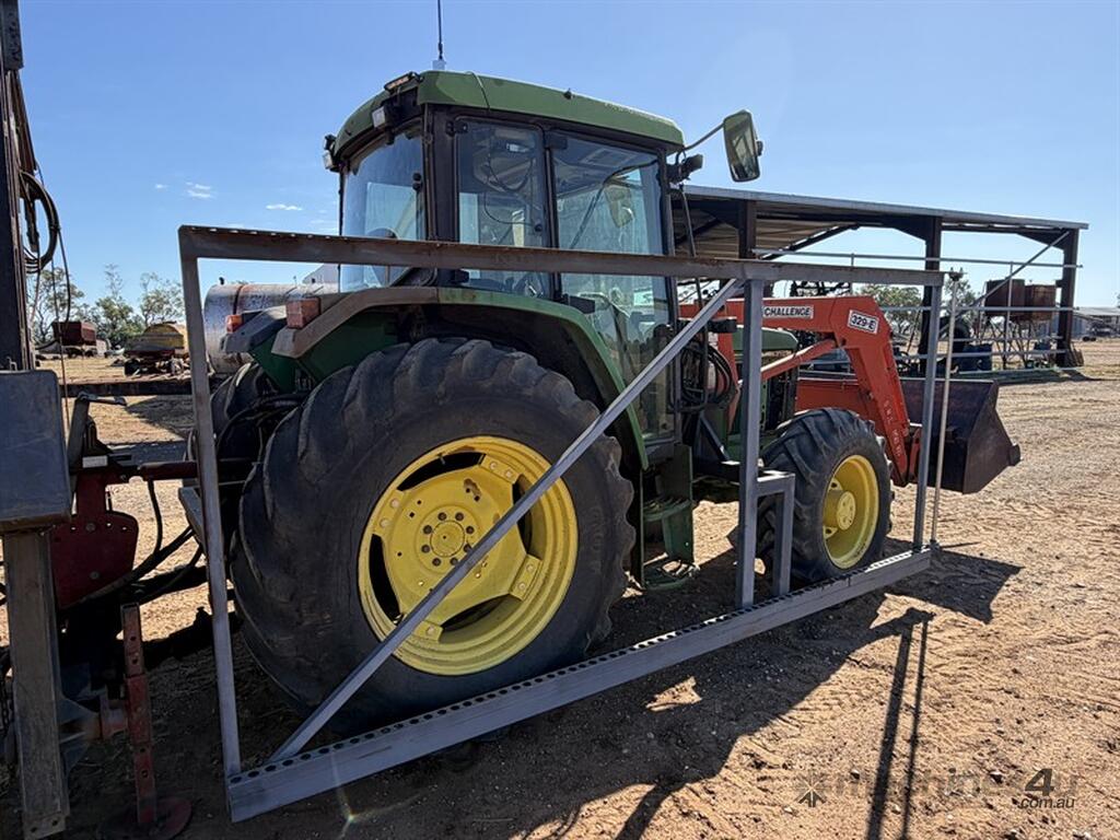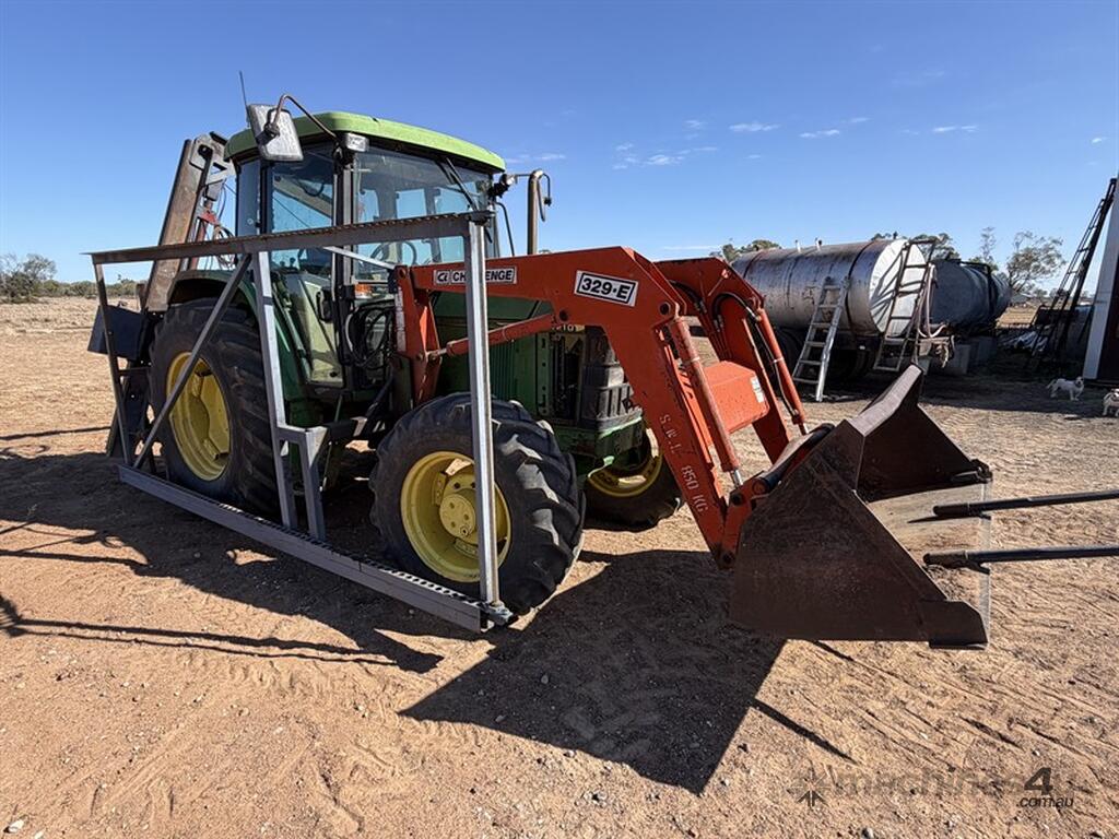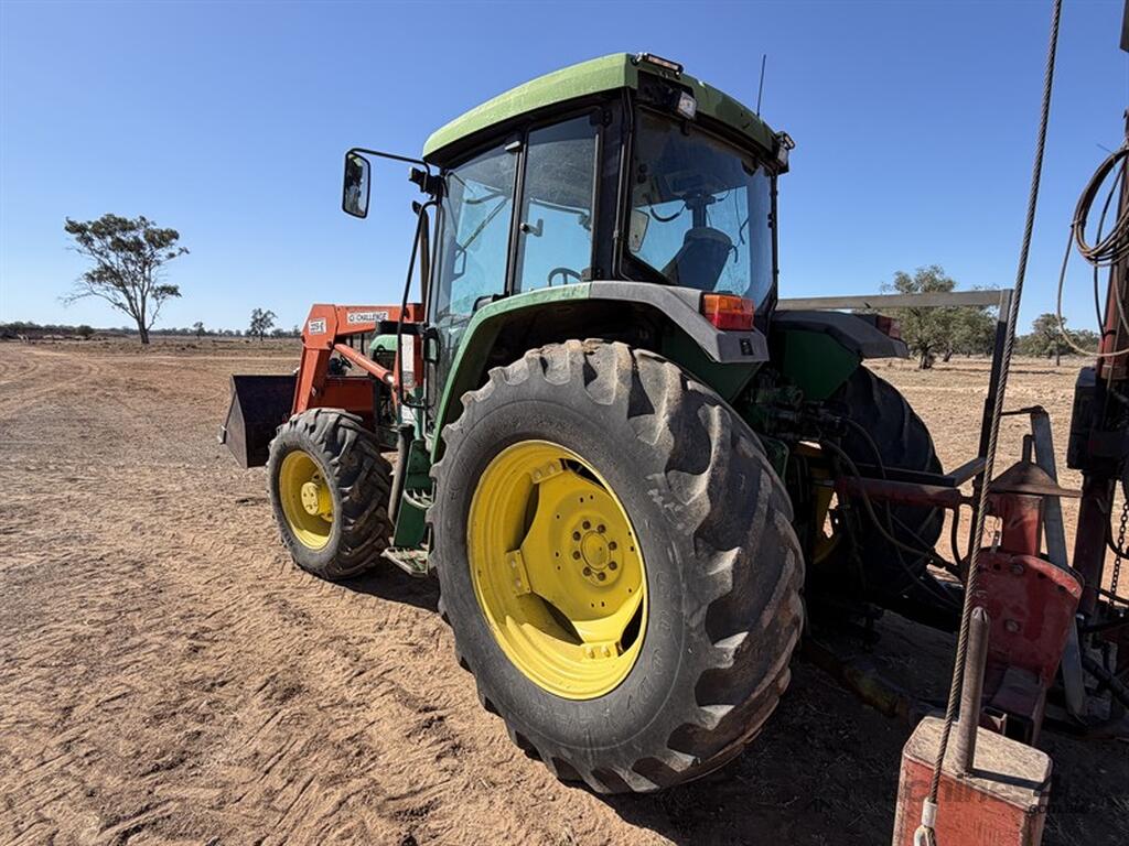 JOHN DEERE 6210 TRACTOR,S/N: L062210Y255203, circa 2000, recently had new hydraulic pump, steering valve, water pump, alternator, fuel lift pump, fitted with Challenge front end loader with bucket, FWA, 3PL, 3 remotes, 12 speed transmission, 9863hrs, NOTE: post driver and fencing frame not included, located Come-by-Chance