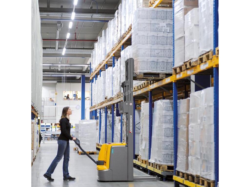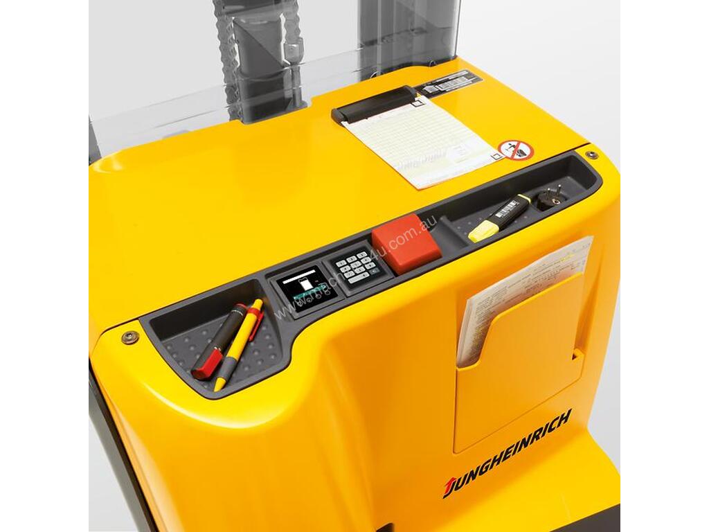 The EJC pedestrian controlled trucks are designed for demanding applications. The trucks offer high lift heights up to 6000 mm, residual capacities as well as long operating times. The powerful 3-phase AC drive motor combined with the controller developed by Jungheinrich, guarantees high performance with simultaneously very low energy consumption. This ensures high throughput.