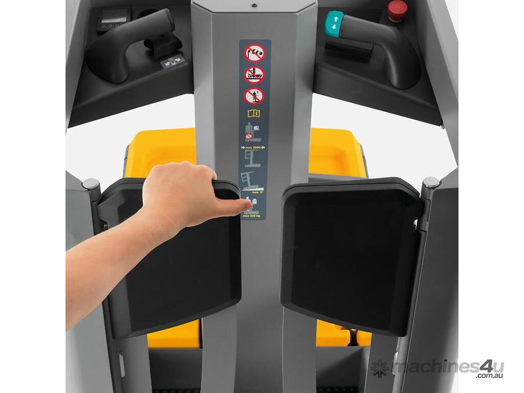The large workstation with ergonomically configured controls allows for simultaneous lifting and driving for direct control of items on the racking. The operator can securely place the items on the storage tray and then proceed to the next item. If several items are to be picked at once, the storage tray can be adjusted in height to ensure there is always good visibility in the direction of travel.