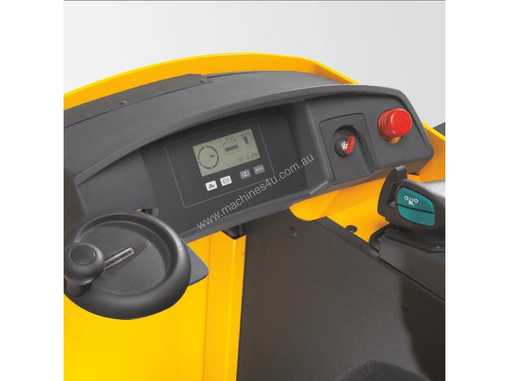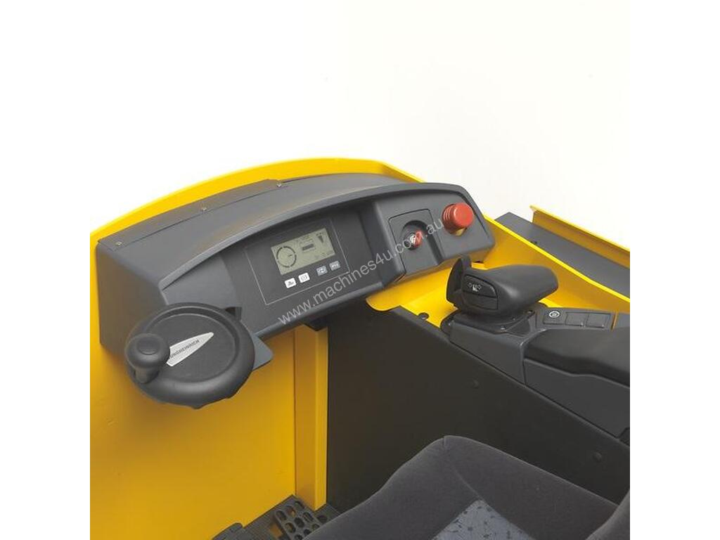 The optional height-adjustable footplate and the adjustable steering wheel ensure comfortable seating positions for all operators. The steering can be switched between 180° and 360°. The 360° steering mode facilitates manoeuvring by allowing “seamless changes of direction with only a few turns of the steering wheel”. The changeover between forward and reverse can also be performed simply by pressing a button.