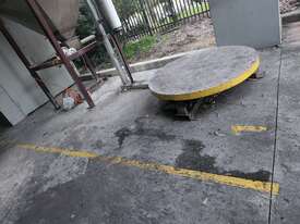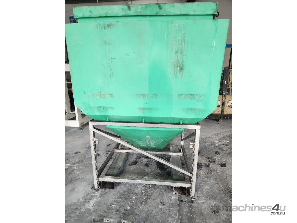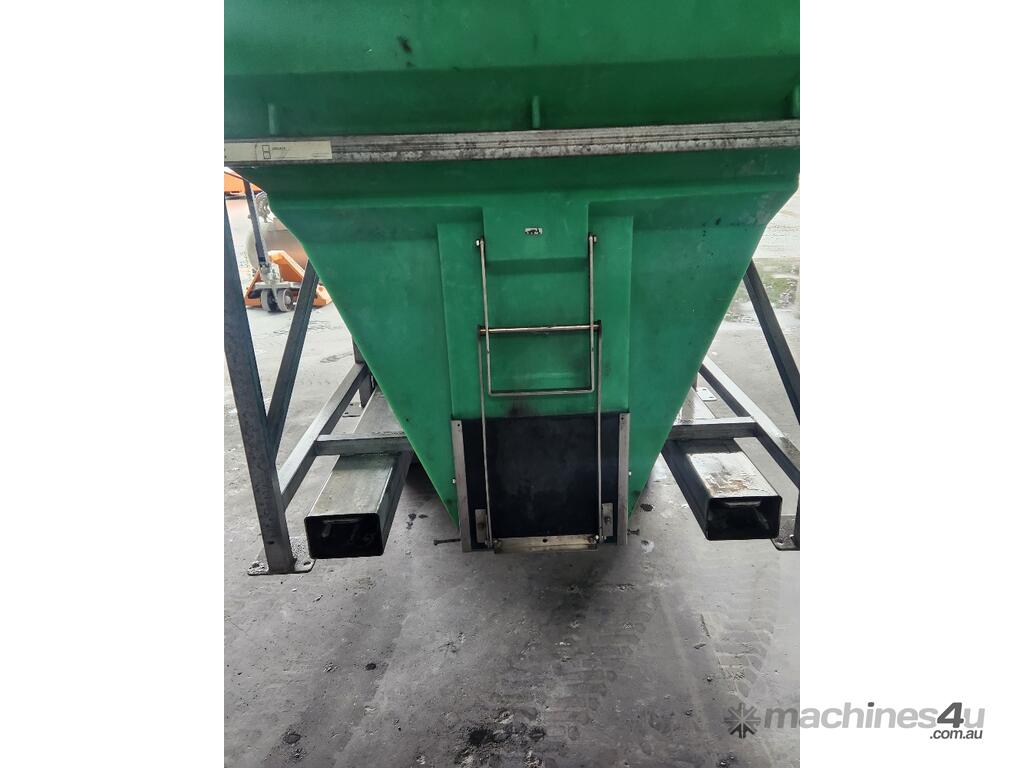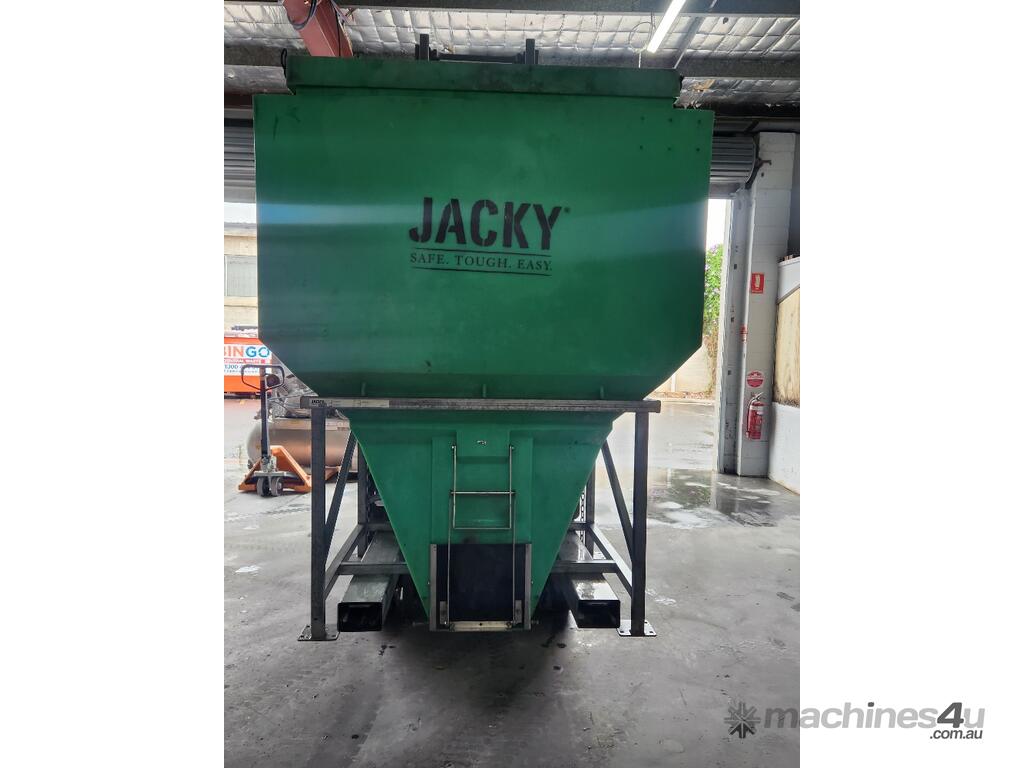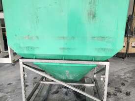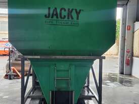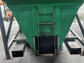 Jacky storage hopper, SWL 1200kgs, discharge delivery shute, custom steel framework to use forks to load.
