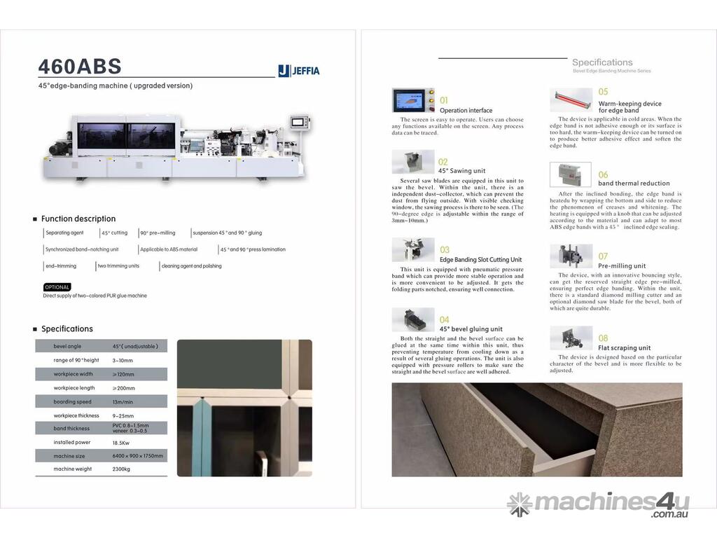 Jeffia 460ABS 45° Edge Bander – Upgraded model with pre-milling, suitable for ABS and PVC edge banding. Supports 45° bevel and straight edges with trimming, scraping and polishing. Ideal for cabinet and furniture manufacturers.
