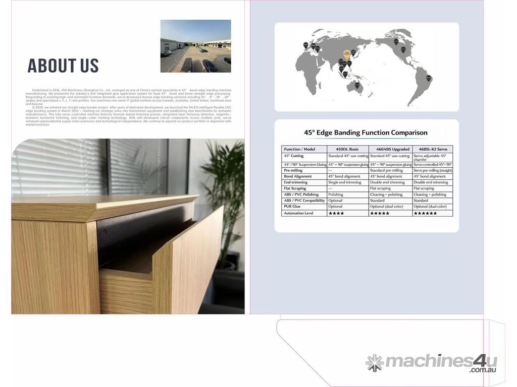 The Jeffia 460ABS is an upgraded industrial edge banding machine designed for high-quality 45° bevel edge and 90° straight edge processing. It is suitable for professional cabinet makers and furniture manufacturers who require superior finish quality and stable performance.